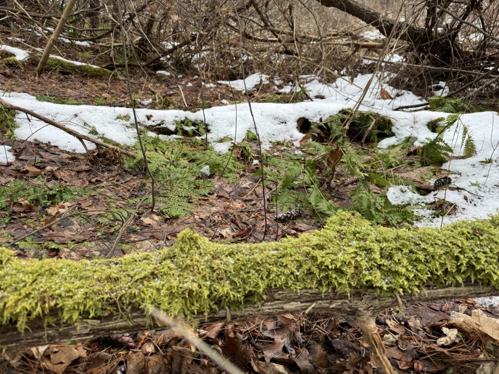 Friday March 22nd, I visited Centennial Woods. The weather was 30 degrees and it was partially sunny. The ground was mostly cleared with small patches of snow from the previous squalls still remaining. The trail was textured by the footsteps of hikers trekking through the previously soft mud, only for it to freeze and harden, creating a rough, solid path.