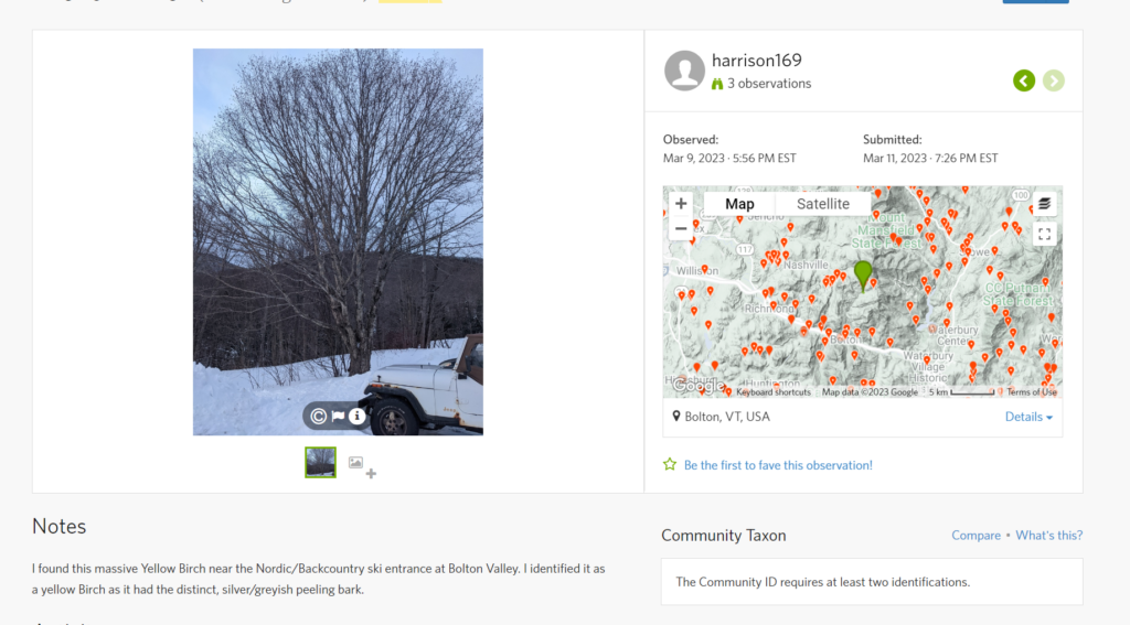 For this phenology assignment, the tree I choose was one I found near the entrance to the backcountry trails at Bolton Valley. It is a very large Yellow Birch which I estimated to be around 150-200 years old.