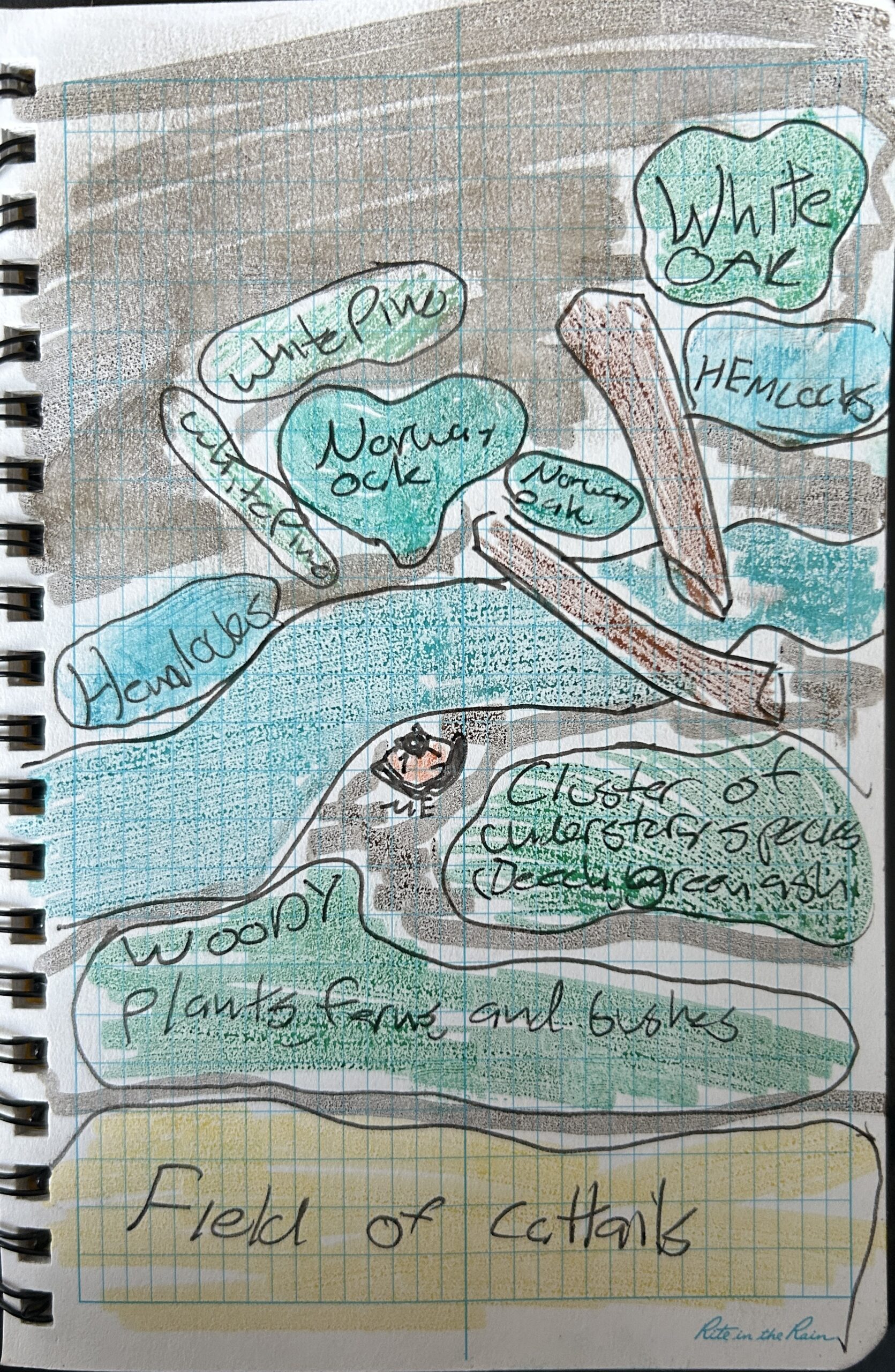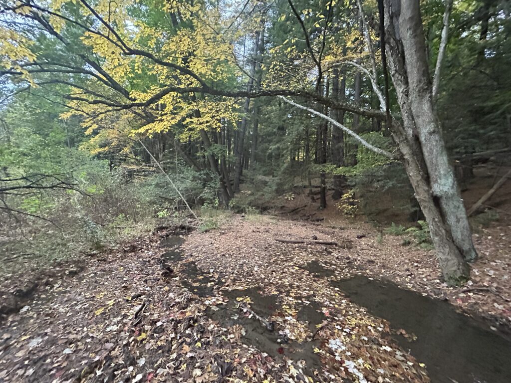 I noticed firstly the gentle trickle of the stream water right in front of me, while leaves rustle periodically in the wind and break away from their branches and drift to the forest bed, adding to the blanket of dead leaves covering the ground, much of it muddy right along the stream. I smell the organic moisture of the river, but mostly just the crisp cold in the air. Around me is a healthy mix of trees completely barren of leaves, fiery orange trees still holding onto their last few dozen, and trees inexplicably still green despite the changing season. Most species are white oak, beech, and different types of maple. There is a notable cluster of white pine, however the only other conifers are the many understory eastern hemlocks that cover the bank. Birds faintly chirp in the distance, however the many bugs previously dominating the area have all gone away, and there is no sign of the multiple squirrels I observed traveling across the upper branches in the earlier month.