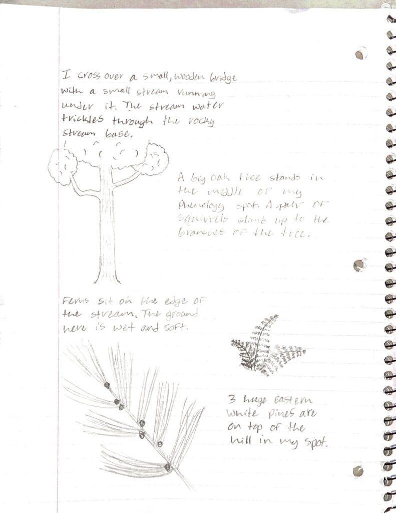 My phenology spot is in Centennial Woods. The fastest way to get there is by going to the back of the hospital parking lot and entering the woods there. My spot has a stream going through it. The vegetation of my area is mainly a mix of large white oaks, and smaller American beech and eastern hemlock trees. There are also a few paper birch, and eastern white pine. There is not a lot of ground vegetation except for a few ferns.