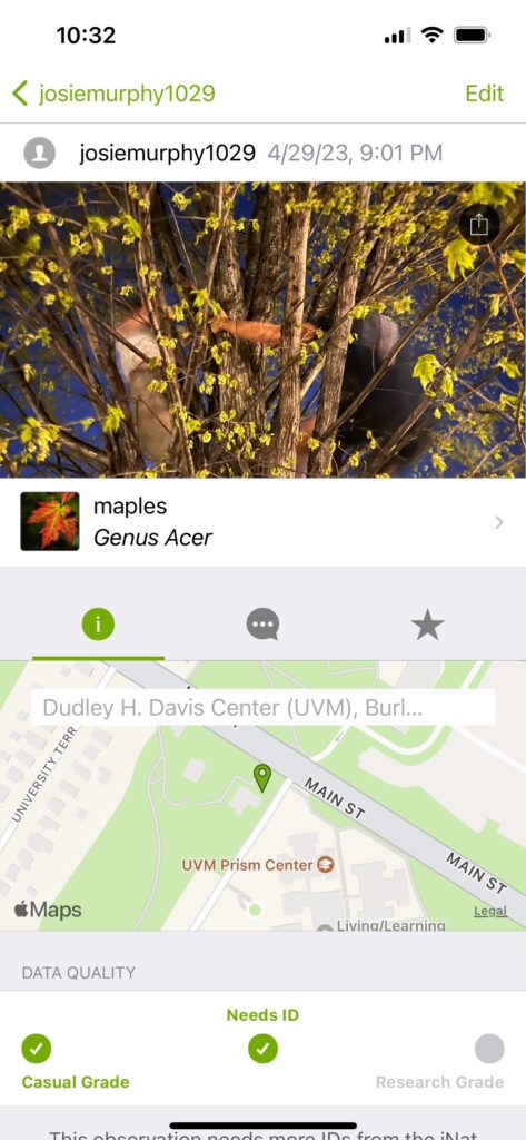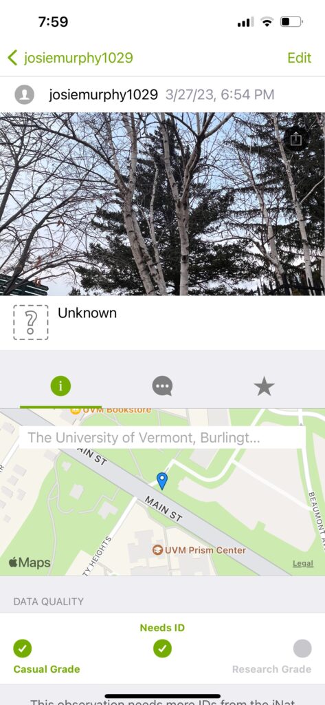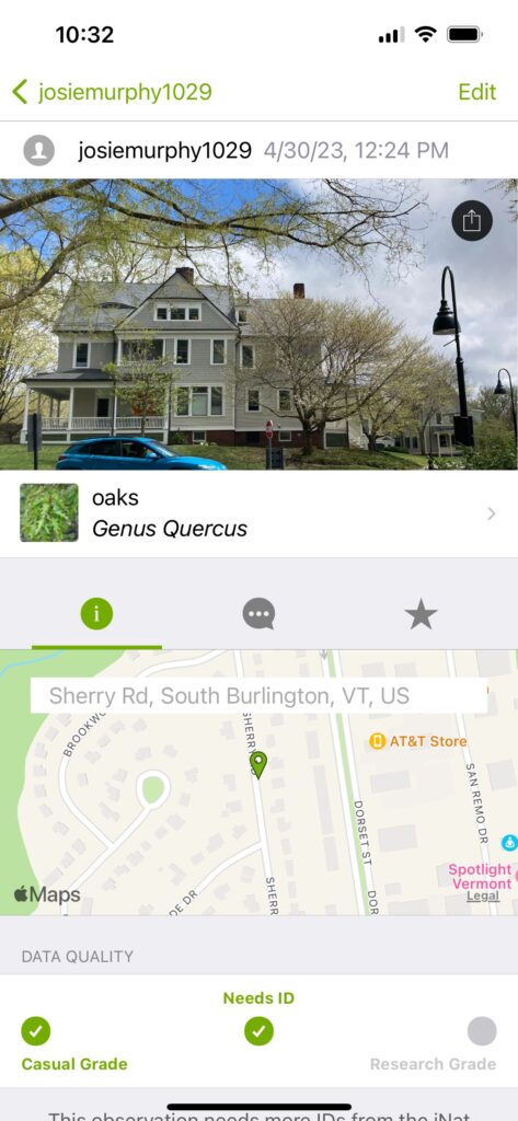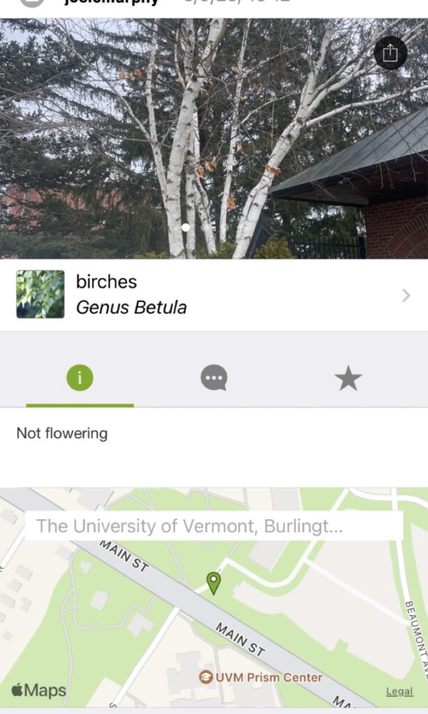 During the city Bioblitz, I walked around parts of campus that had a lot of trees, as well as down in South Burlington near the target. I found two species of trees, one maple and one oak, Inaturalist wasnt able to tell me the exact species but I believe it was a sugar maple and a White Oak. Inaturalist was a cool way to identify the species I encountered, however I never really got to understand how to use it that well with uploading so that people can see it. So, I would give it maybe a 6/10. I found it interesting that other places more tropical had such interesting species. Obviously more tropical areas have more biodiversity, but places like Florida recorded alligators, as if they just walk outside and find an alligator.