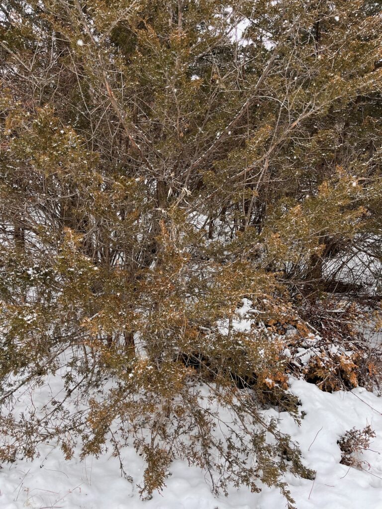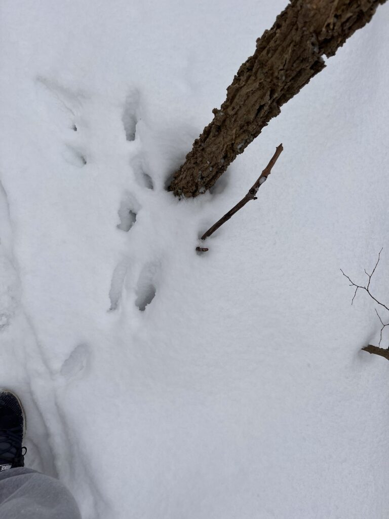 Returning to my spot after a good long break made the phenological changes really stand out. There are no more leaves on the trees, except for the cedars, and as far as I can tell, the grass and moss between rocks is still dead. There were no berries left on the bushes. Usually I can see the lake and the New York mountains from my spot, but with the snow, it made visibility hard. Snow covered every part of my spot so it kind of sound proofed the area so I couldn’t really hear much wildlife. Although I did one track of animal prints that I believe to be Rabbit or Hare!