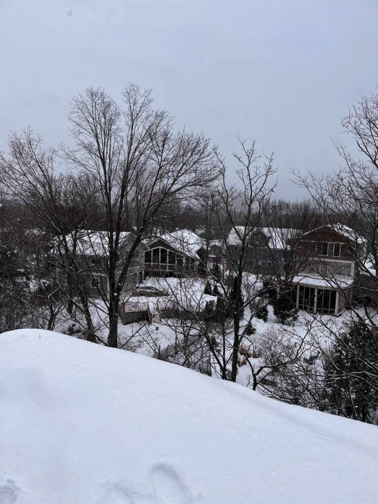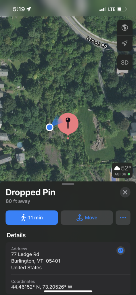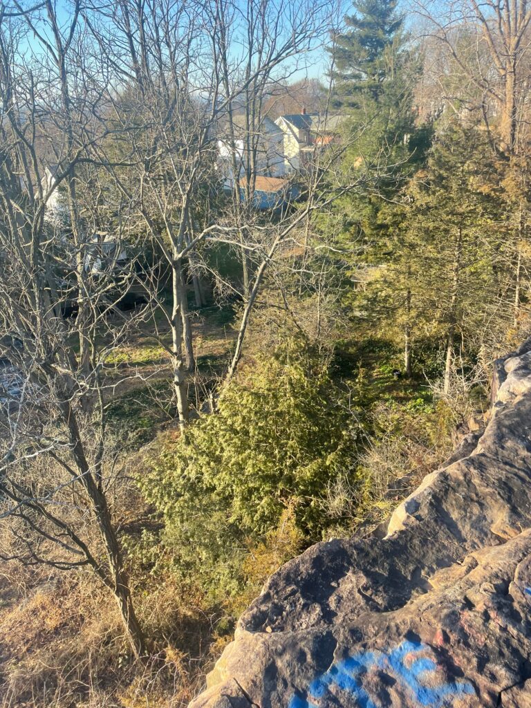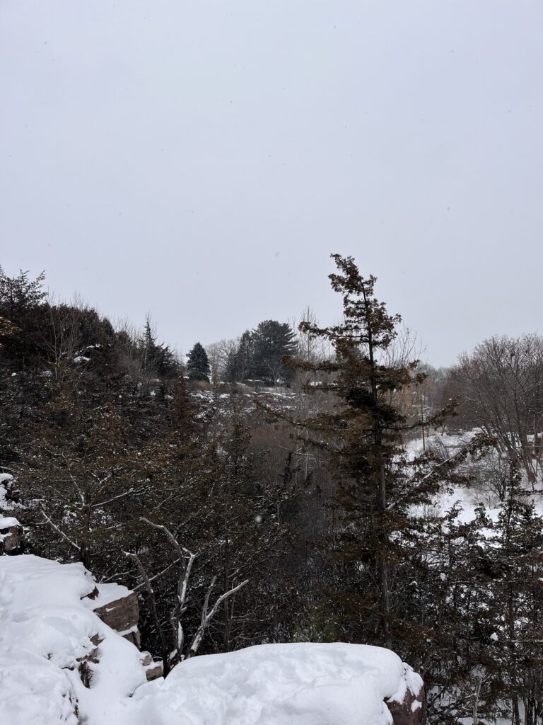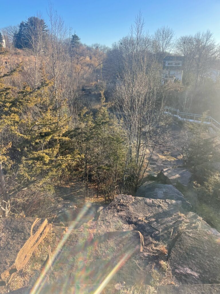 Looking back at my first phenology post, there was an abundance of leaves on basically all of the trees. Throughout the season, all but a few trees lost their leaves. The trees that toughed it out were the firs and the pines, keeping all their needles. The ground at my spot was mostly covered in dead leaves with little sign of decomposition. I did notice some squirrel poop on the rocks nearby where I was standing. I could hear some scuffling in the trees and a few birds flew out, there were also crows circling around the site. In contrast to my first visit, there was less noise from wildlife, though that could have been from the wind howling. I also saw more animals during my first visit such as squirrels and chipmunks. The aspects I love the most about my site are the views, the rocks overlook the small woods behind cute neighborhood houses and you can see the lake. This was overall an enjoyable experience and I’ll definitely be making visits back to my spot.