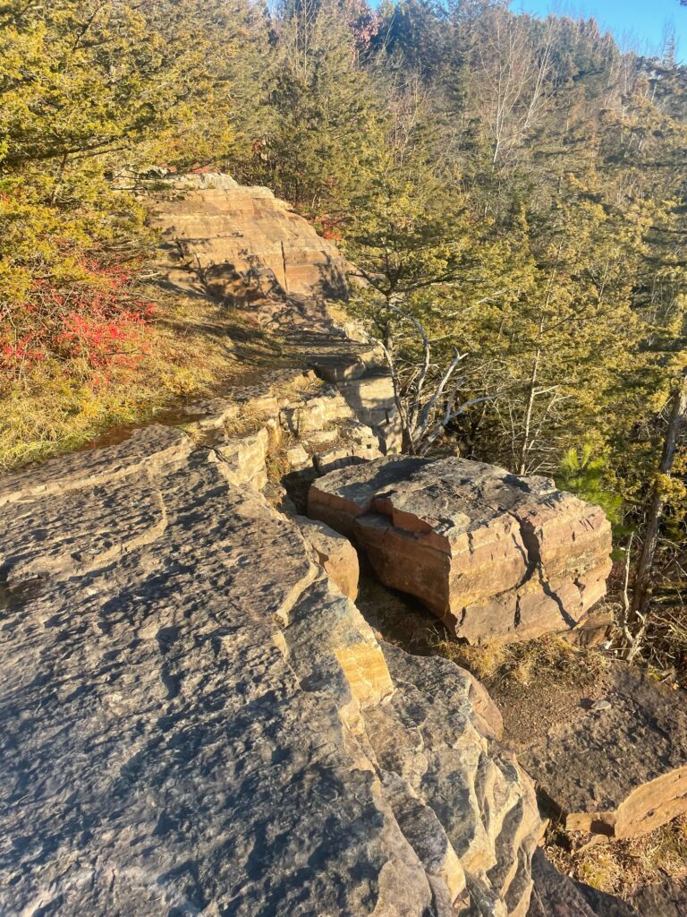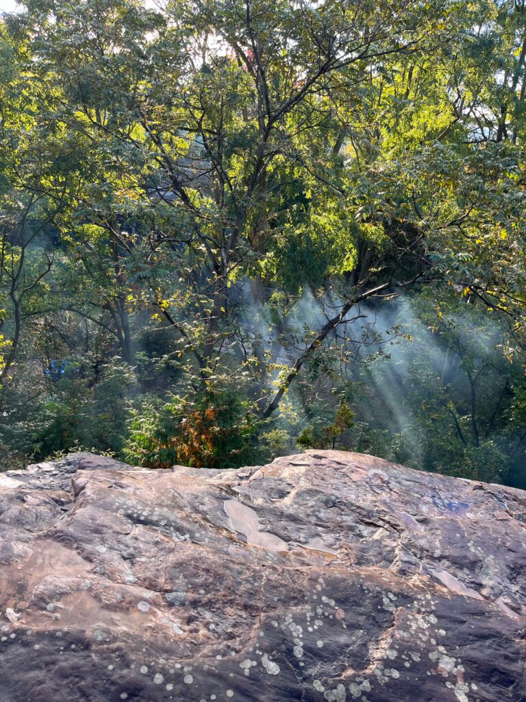 I haven’t exactly picked a name for my place but it is off of a street called “Ledge Road”, so as of now, I’ll call it the ledges. You get to the ledges by walking past redstone, and past the country club, which takes you onto Ledge Road. Walking down the hill of the road you’ll notice a few streets that you have to walk past until, on the left side of the road, there is a little clearing for a path. You take the short path all the way to the ledges and that’s how you get there! I chose this place literally because it’s pretty and has an overlook. There are all types of trees here at the ledges as well as more understory plants on the path. Theres also some moss and grass growing between the rocks. The trees are all changing colors and are super vibrant at this point.