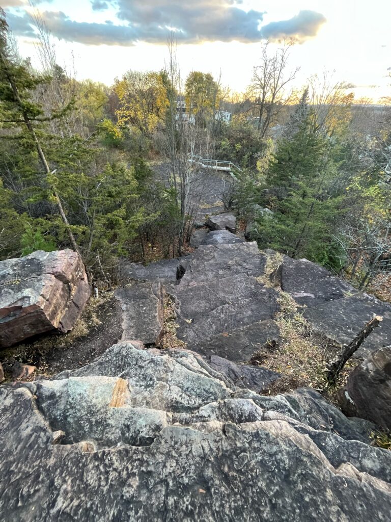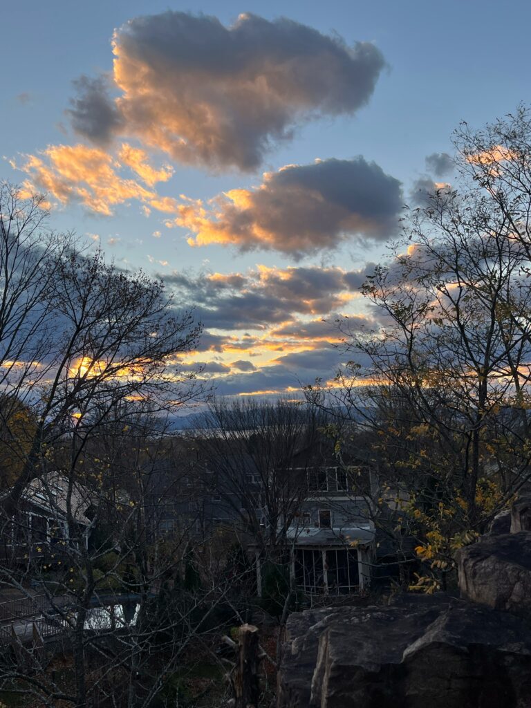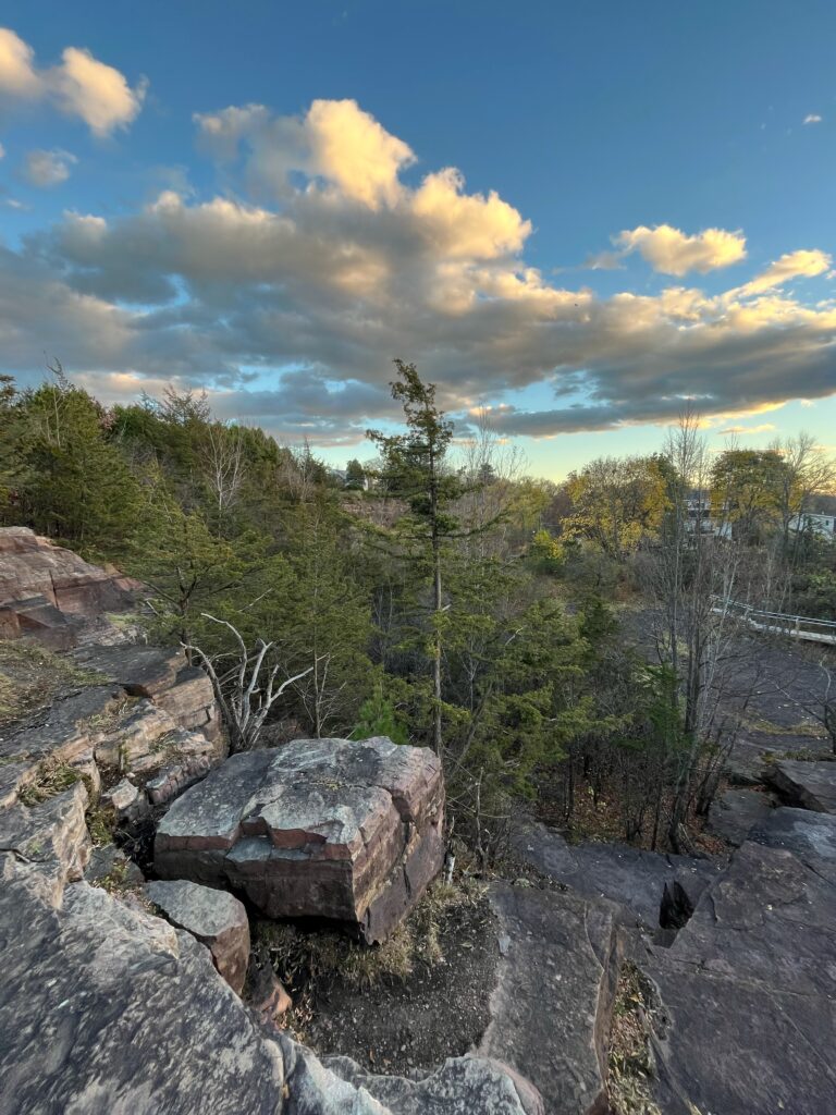 Today was very windy but still very peaceful at the ledges. In my 15 minutes of peace, i heard the hind whistle of the wind and shockingly the tweets of smaller sounding birds (for some reason I feel like birds dont exist in November). I heard geese that were probably migrating south. Lots of crows were circling around overhead. A very big bird day I suppose! Some of the Sugar Maples still have their bright yellow leaves but most of the other trees are bare at the moment. The rocks are dark from rain that had just happened. The moss and grass previously thriving between the rocks is now starting to die. An interesting moment was when I saw something red fly by and I thought it was a cardinal (which is the state bird of Virginia, where I am from), so that was a very exciting moment for me. Even though it was most likely not a cardinal and just a red leaf it was like a spiritual connection I felt to the place. Now that most of the trees, aside from the cedars, are bare, I have a pretty good view of the lake and was able to enjoy a nice sunset.