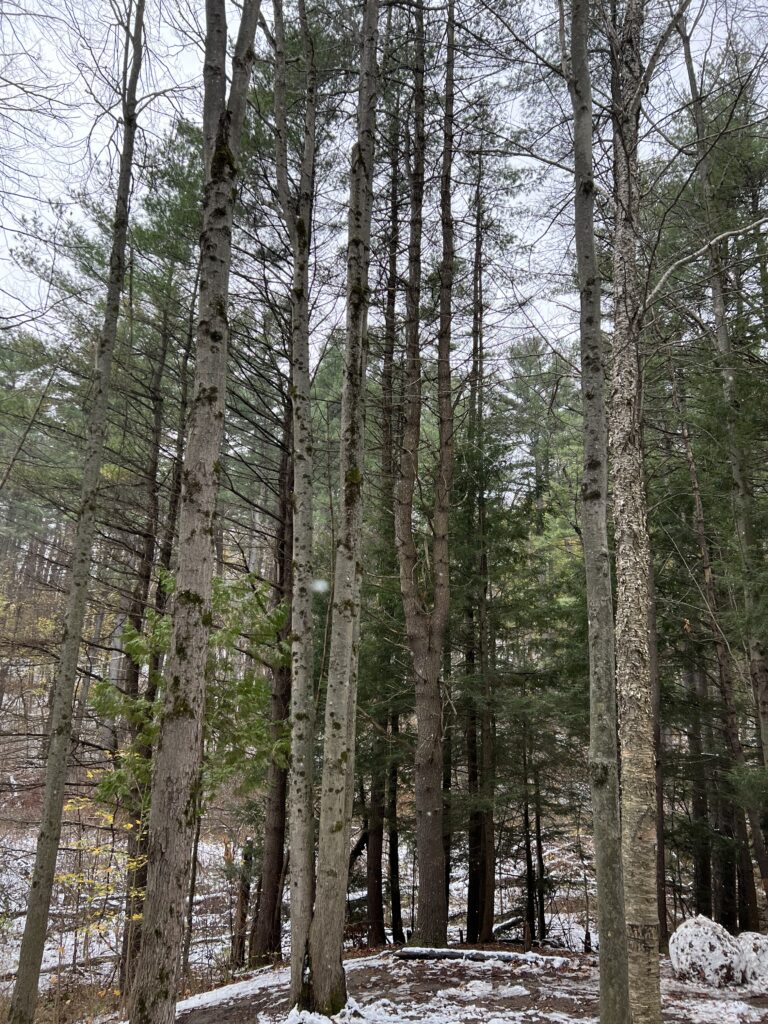As we come to an end, we have seen so much change happen to our Phenology spot in Centennial Woods! From November to December it had been a long journey of foliage and growth. As we know the leaves of trees in the woods had stayed a pretty orange-red color for a while. In Vermont leaves tend to fall off trees in late October, where in Centennial Woods the leaves of many red maples were still on the branches. Even though some were making its way down on the ground it’s interesting to see if different tress in different areas behave. As we can see in the second picture there are so many leaves on the ground from multiple different trees. I have not seen any signs of fruits or vegetation. In addition I had seen small marks on trees back In November which were most likely from squirrels. This time when I went I didn’t look that much into the markings, I didn’t find has much as last time. This could be because the squirrels are staying in their shelter to keep warm for the winter and they aren’t out and about this time around.