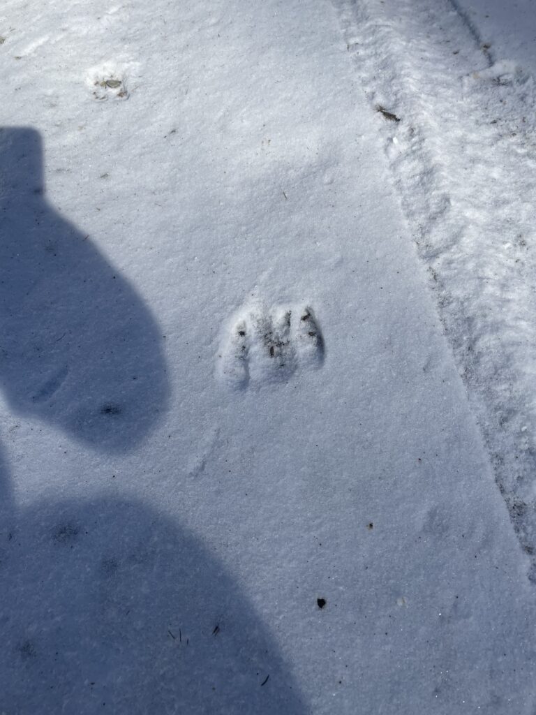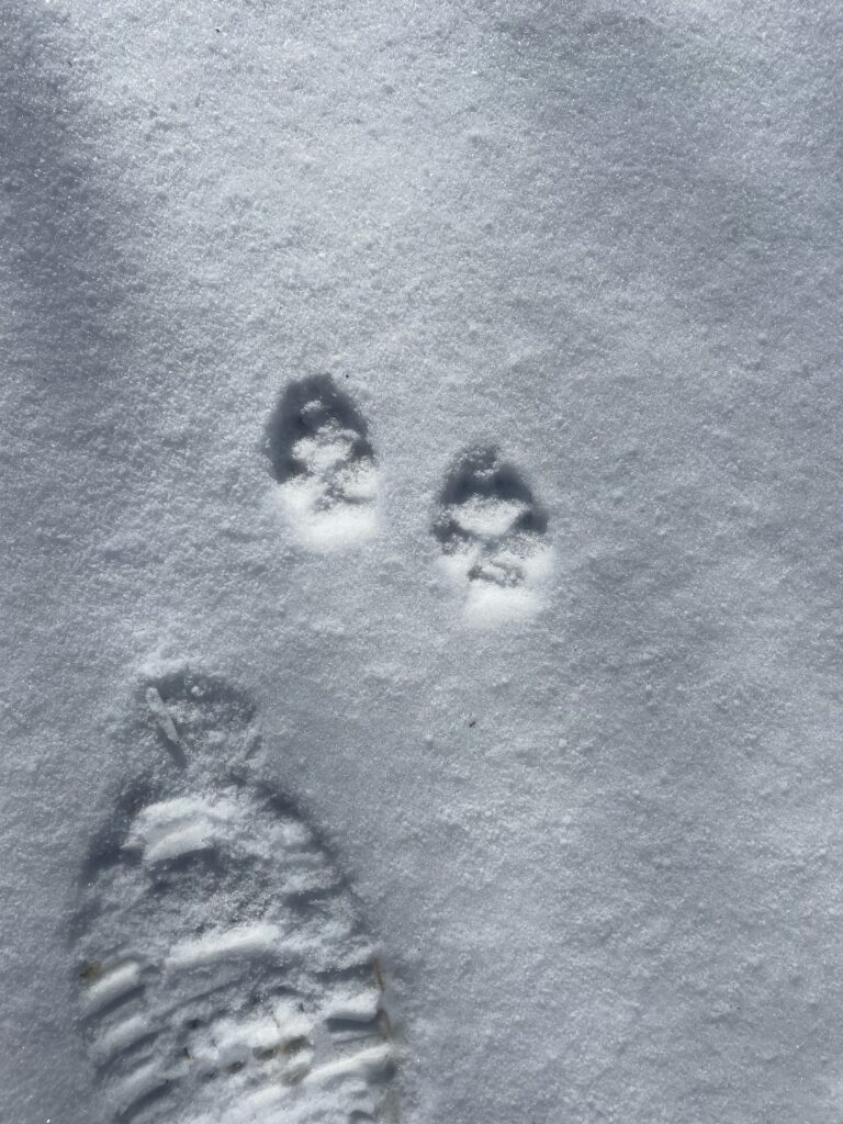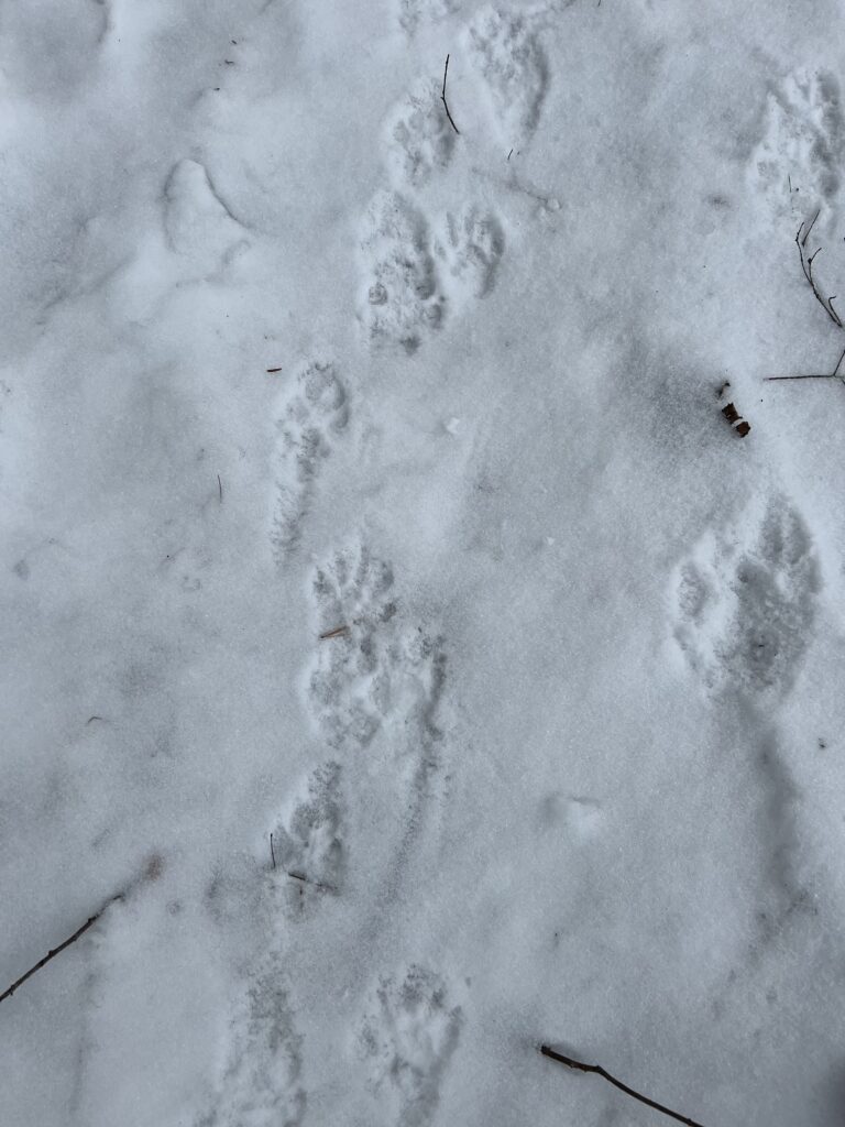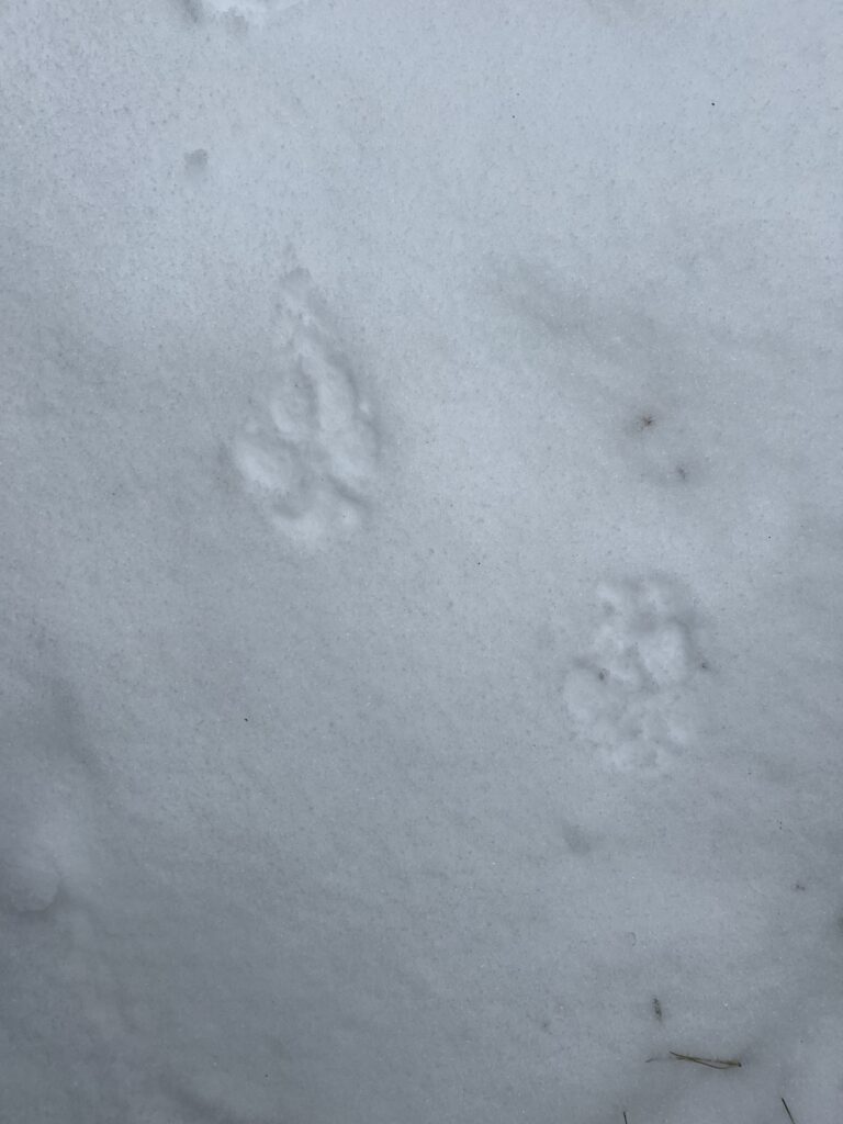 For these foot prints, INaturalist kind of gave me the same recommendation as the Whitetail deer, but for these prints I think it could actually be the eastern cottontail or snowshoe hare because the prints are pretty small. The foot prints were kind of frozen, but when I got a closer look and I felt the foot prints. I could feel the toe marks and a little bit of the claw marks. I’m not actually quite sure what this animal could be. The way I narrowed it down to either a snowshoe hare or an eastern cottontail was because I believe it is some sort of bunny/rabbit because of how small the prints are. These prints were only about 3 inches.