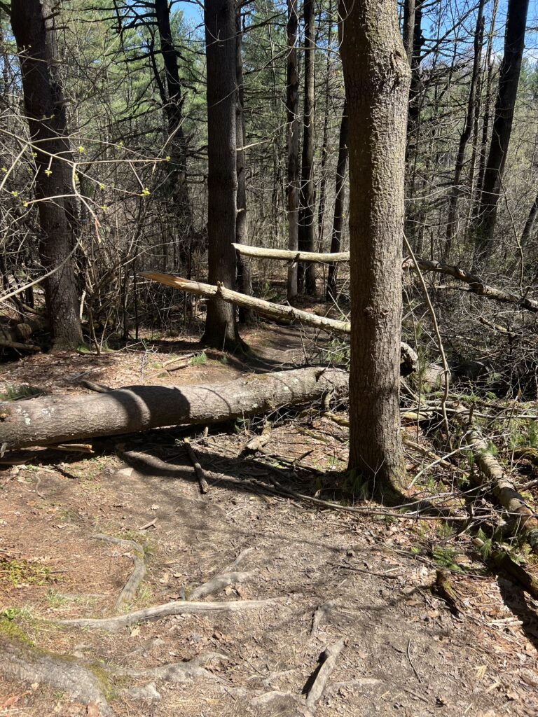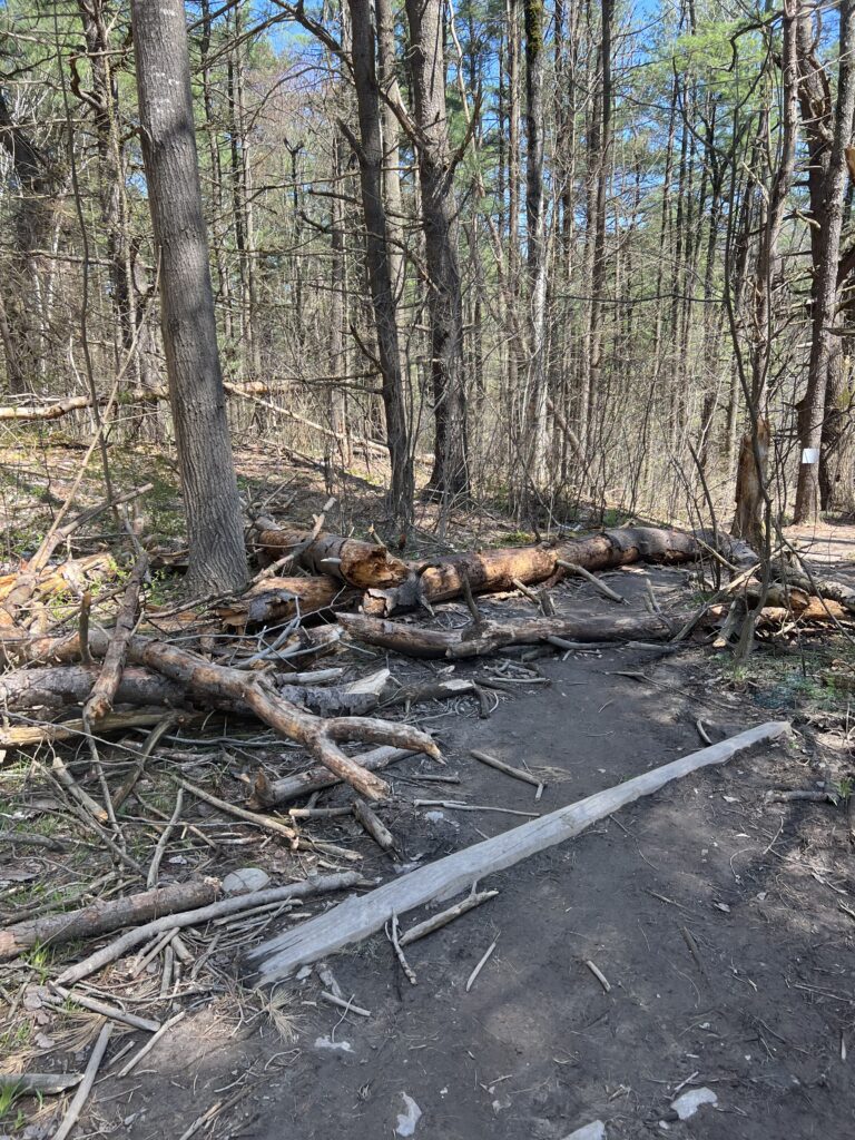 The walk to Centennial Woods is usually not bad at all. There aren’t many objects in the way of the paths. But today, as I was walking on the trail, I noticed so many fallen and damaged trees! Here are a few photos I took on the path with fallen trees on my way to my phenology spot: