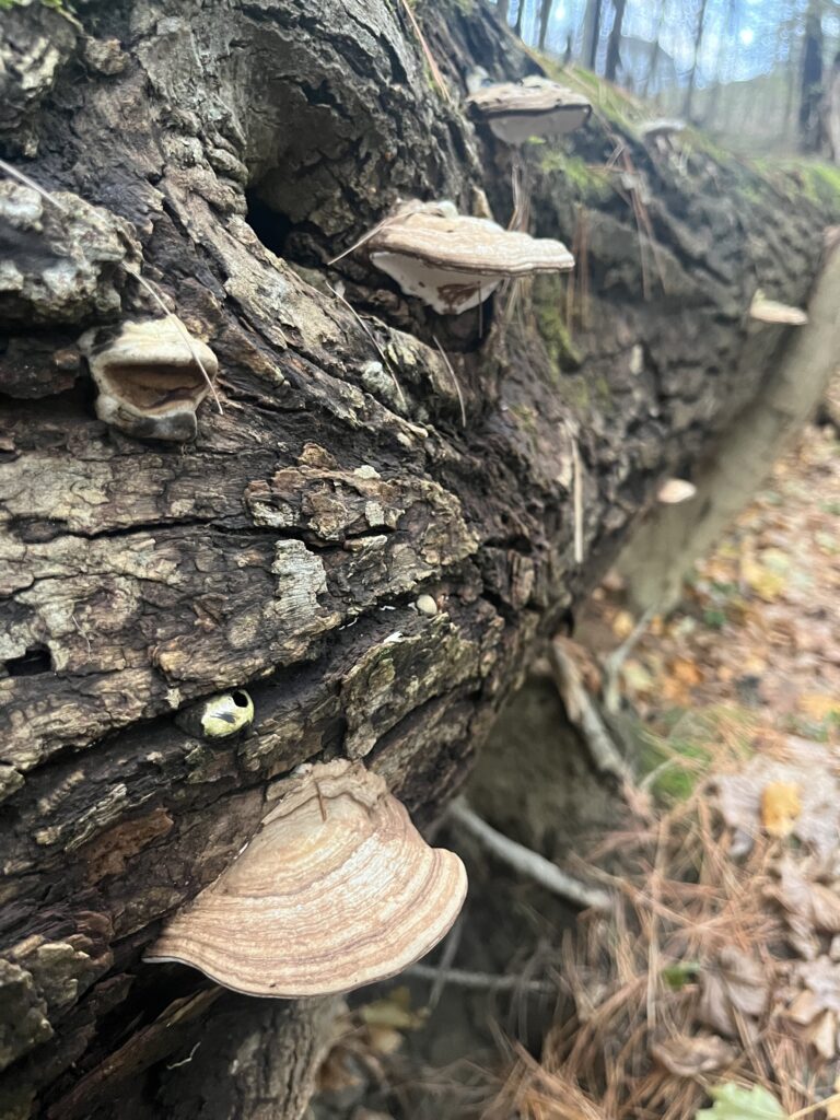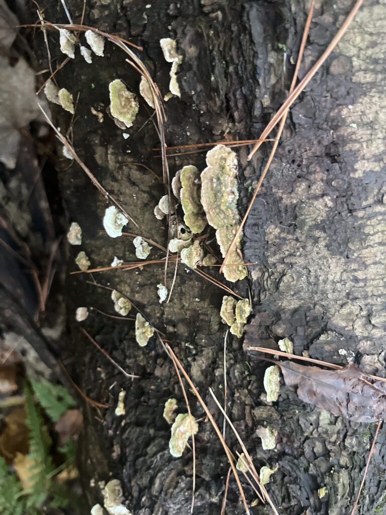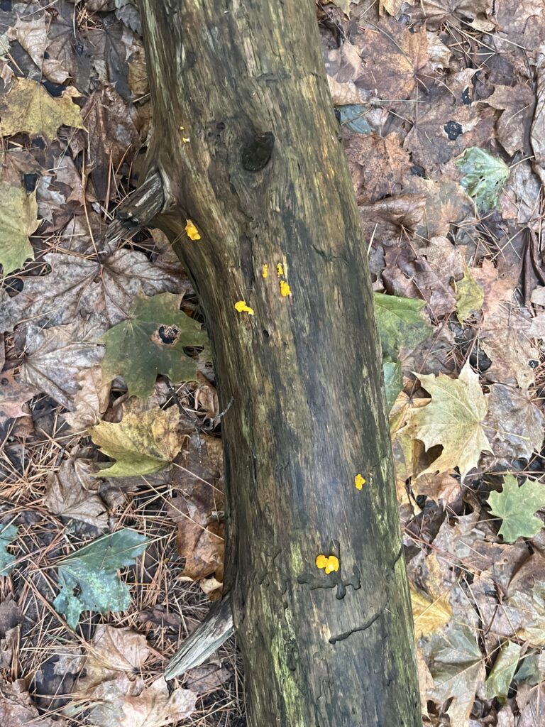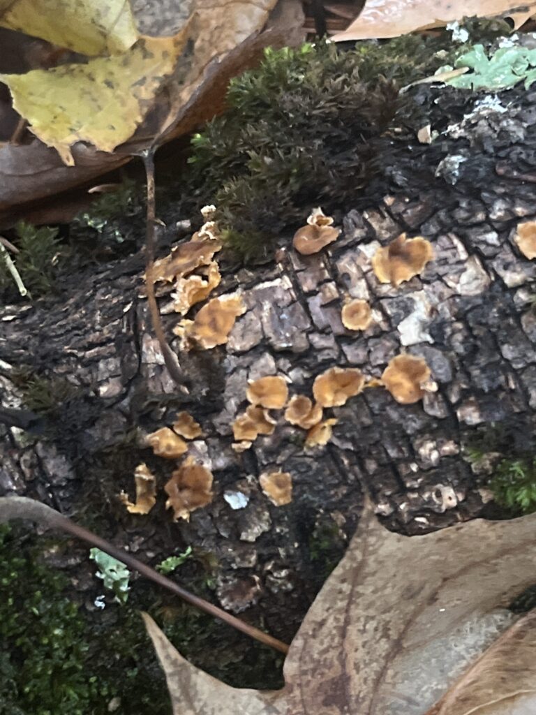 ╰┈➤ Something unexpected that took place in my spot over the weeks of my absence was a boom in mushroom growth! While the ones on the ground have been stamped out by the leaf litter that blocks their view of sunlight, the ones on the numerous fallen and decomposing logs are taking the elements in stride! I would have thought it’d be getting too cold for mushroom season, but these mushrooms are hardy (Figure 2). I also finally got iNaturalist to work in my spot, and identified the genus of three of the most popular mushrooms in my area, which are Genus Ganoderma (most likely Artist Bracket, Figure 2), Genus Dacrymyces (Figure 3), Genus Stereum (Figure 4) and Genus Trichaptum (Figure 5).