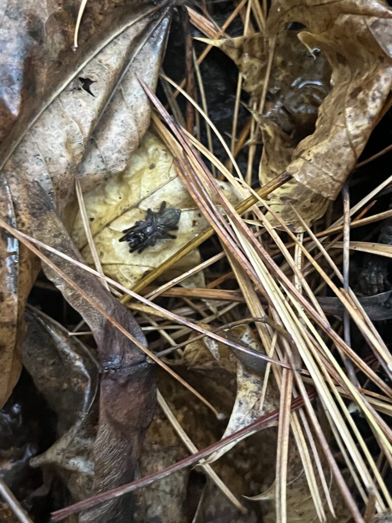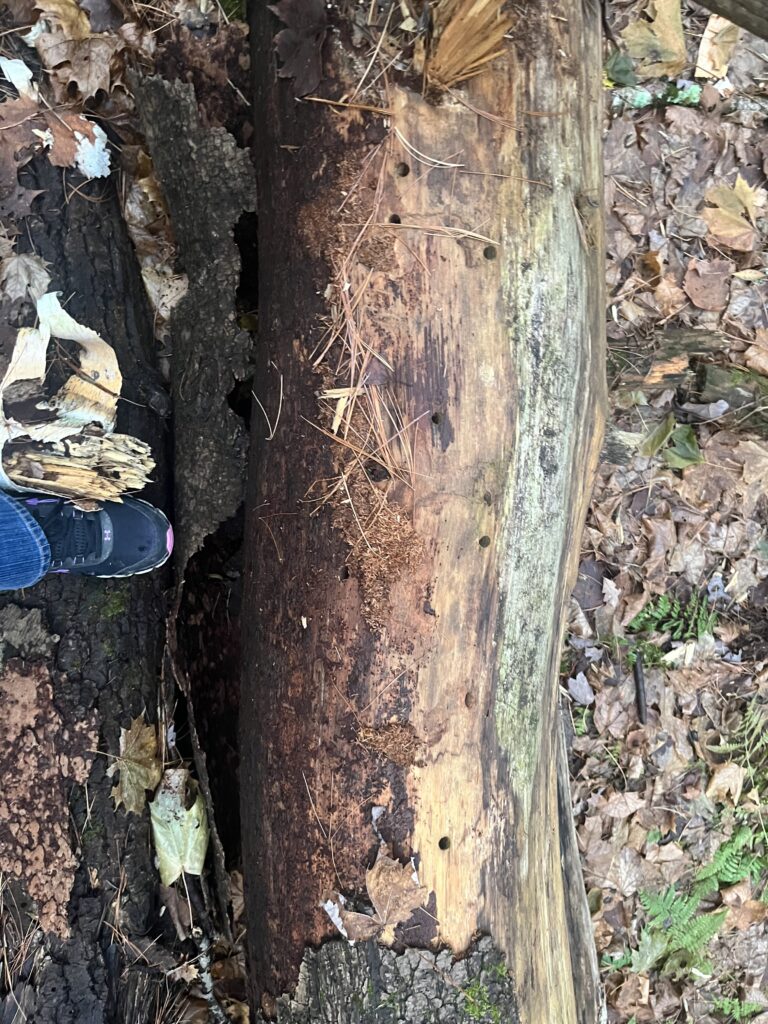 ╰┈➤In Figure 6, one of the former inhabitants of the leaf litter, a wolf spider, is shown curled up on its back, most likely having succumbed to the elements. I’m sure there were tons of other bugs that had done the same in the log in the center of my area. The only other hints of animal presence were the new insect bores in the fallen logs, shown in Figure 7, that are most likely the homes of multiple bugs looking for shelter and food in the decaying log.