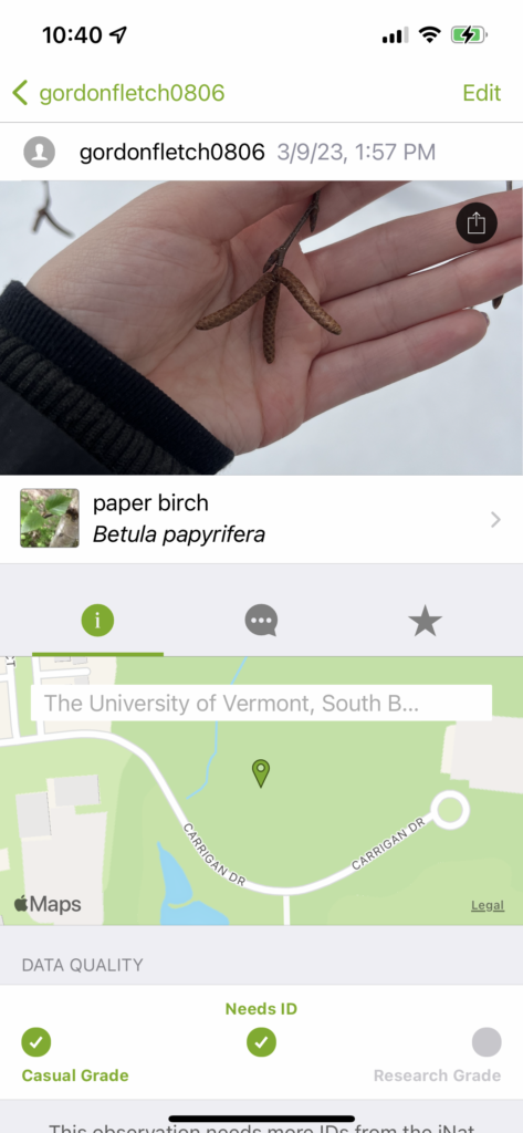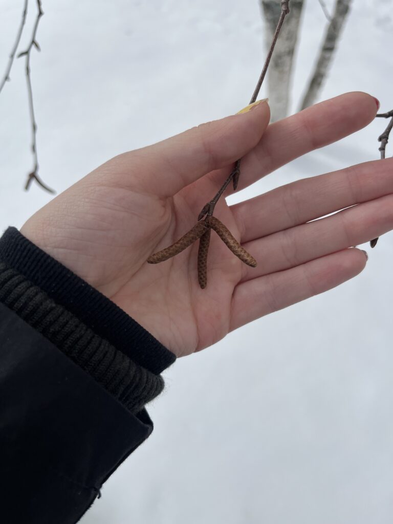 The tree that I found around my phenology spot and chose to talk about was a middle-stage Paper Birch that was in the process of budding new leaves. Yellow Birch and River Birch have smaller buds that are more like buds you would expect from a deciduous tree, while Silver Birches have much larger buds that are extremely pinecone-like. These medium sized charismatic pinecone-like buds are hard to miss, especially paired with the unique white, peeling bark, and we definitely have a Paper Birch on our hands! I can’t wait to come back after spring break and see if it’s budded at all!