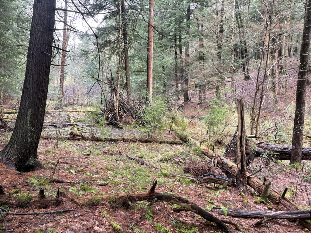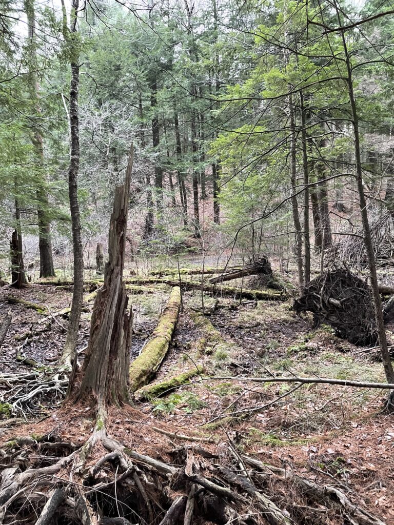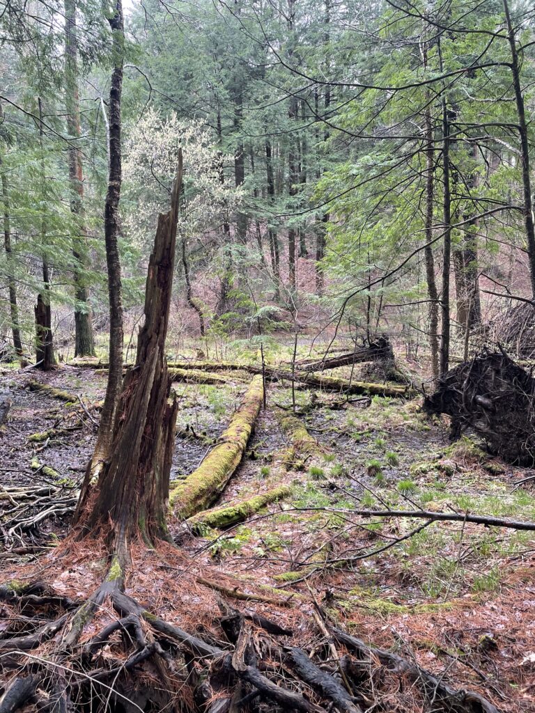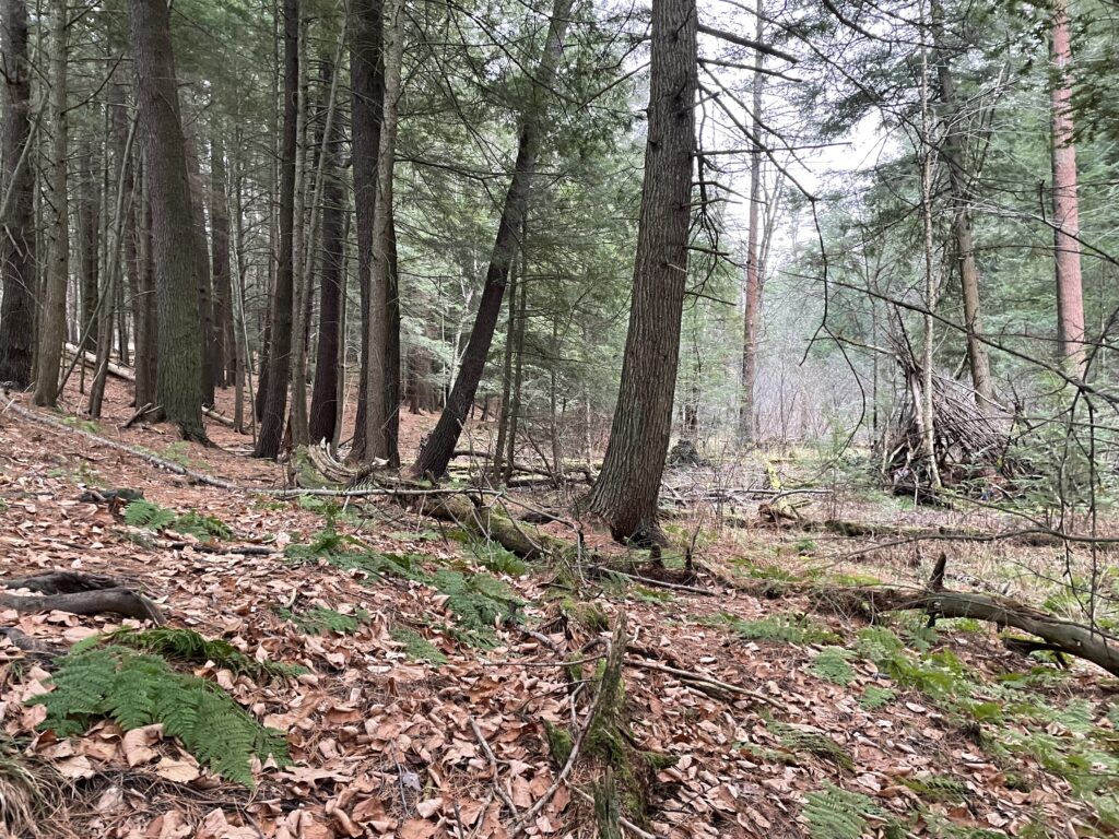 • Storm/Human Changes: Upon reviewing my observations and photos over the course of the year, I concluded there were very little changes that occurred other than phenological ones. However, presumably because of the windy conditions throughout the season, there appeared to be large debris from the mature tree stands towering above. As a result, the understory plant species population decreased significantly from October, 2022. On the other hand, there was a large number of eastern hemlock saplings sprouting from the “Transition Zone” of my location. This area experience less natural disturbance from weather, preserving current understory species and emerging ones.