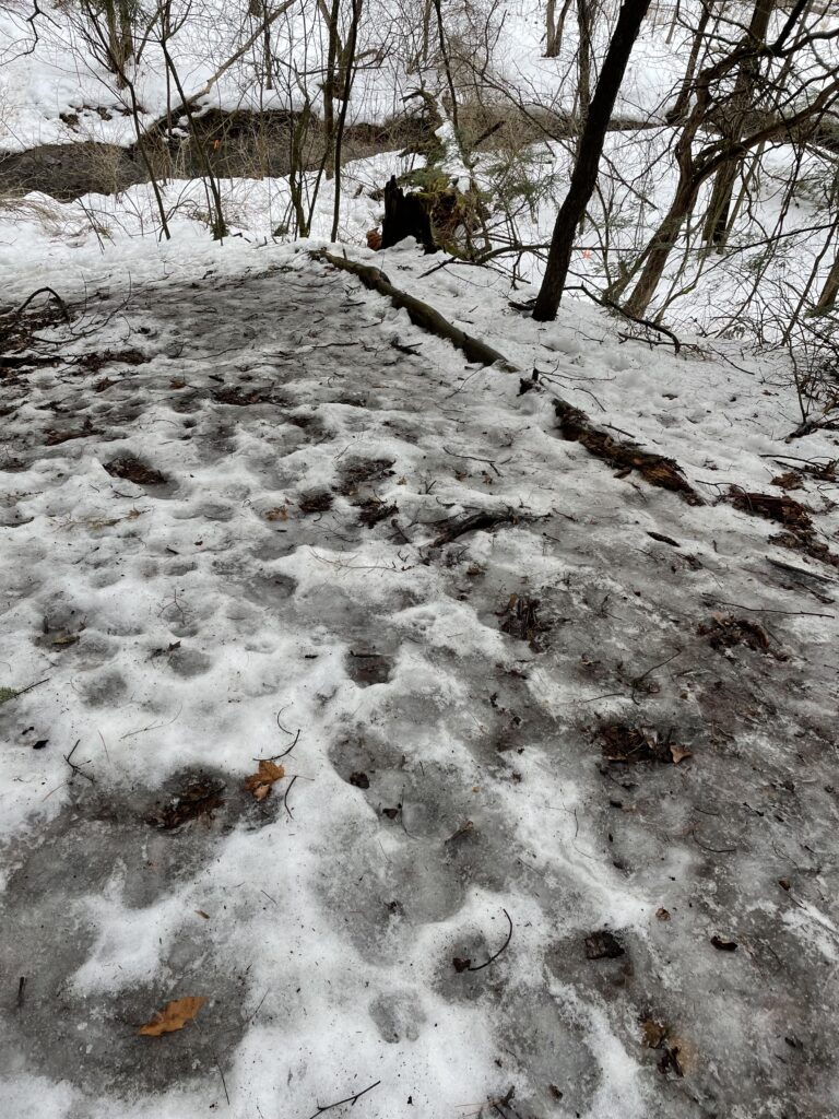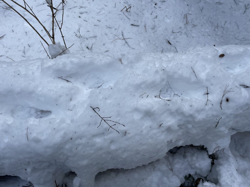 • All of these destroy or cover animal tracks that had once been there. However, I came across footprints that crossed over a log and led into the large stream bordering my spot. I had a difficult time uncovering the identity of the animal as the prints had faded tremendously. Hopefully I will be more successful next time, when there is a fresh coat of snow!