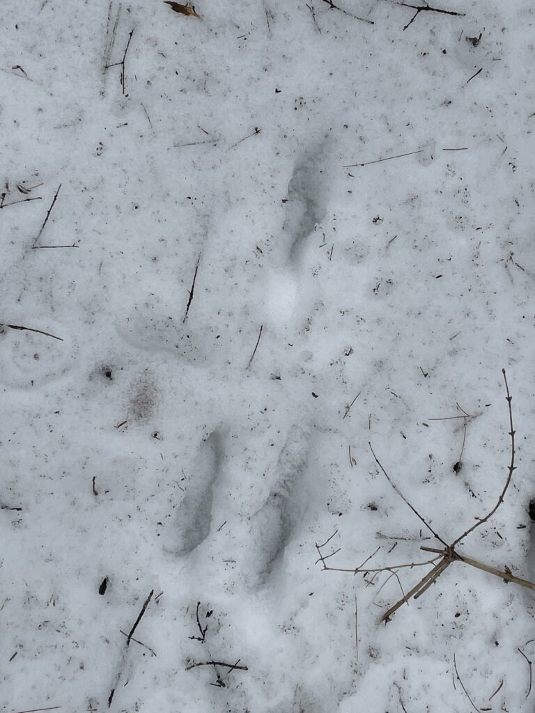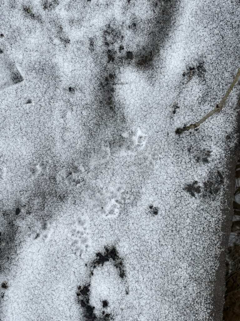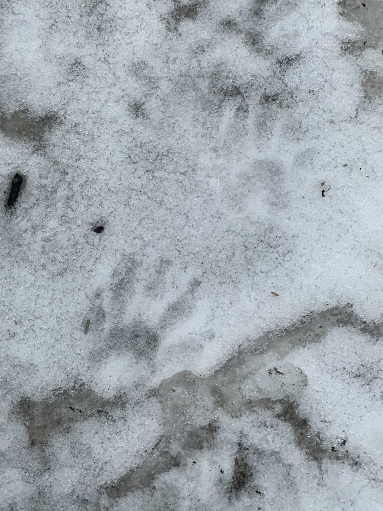 For the species such as raccoon and cotton tail rabbit, I had a fairly easy time determining their tracks. Rabbits have a very unique gait pattern and track sizes for example. It was clear that it was a cottontail rabbit based on the size of its hind legs in comparison to snowshoe hares. The raccoons were easy to decipher due to their easily-identifiable front track shape and size. With regards to identifying the squirrel’s tracks, I was able to differentiate between a red and gray squirrel based on the size of the tracks as well as the front foot placement (red squirrels often lands with one front paw slightly in front of the other). I really struggled to identify the red fox tracks due to how faded they were and how clustered they were. I found them at the edge of a creek, and the prints were overlapping each other which made it difficult to find a gait pattern or clear tracks. I was able to decide upon red fox based upon the size of the tracks, pad of the foot, and the oval pattern of the toes. I am not 100% sure about this identification to be honest though!