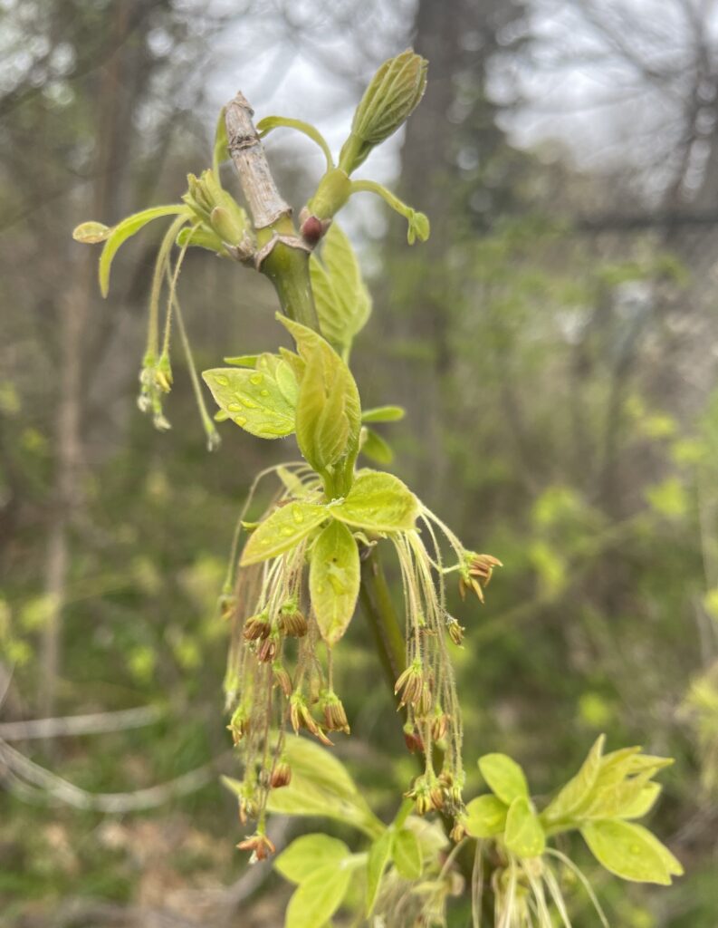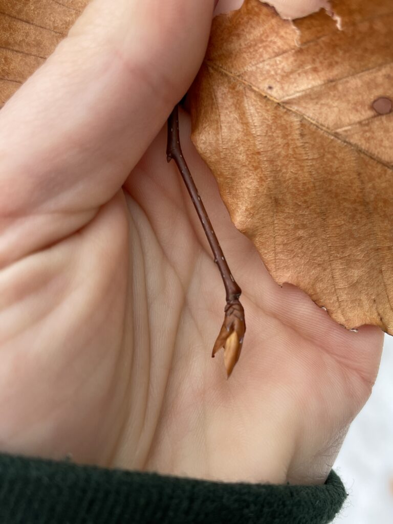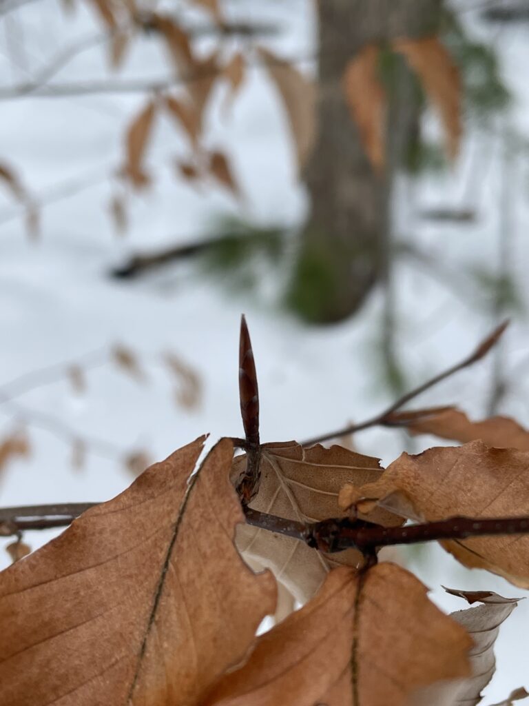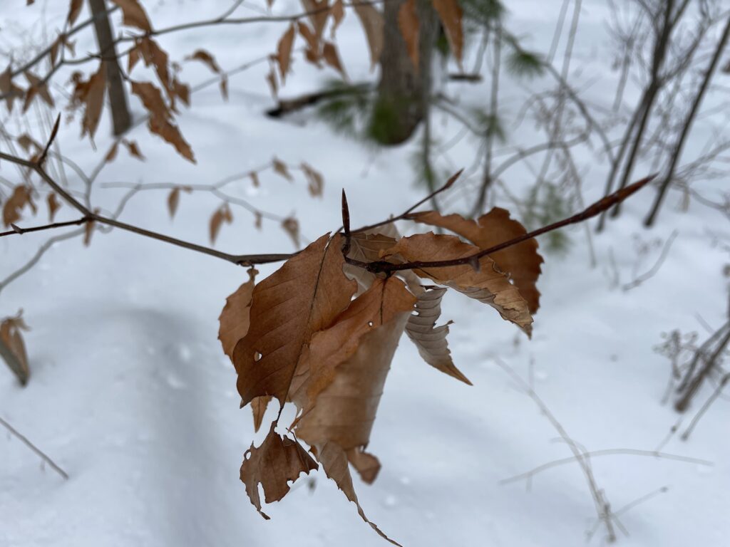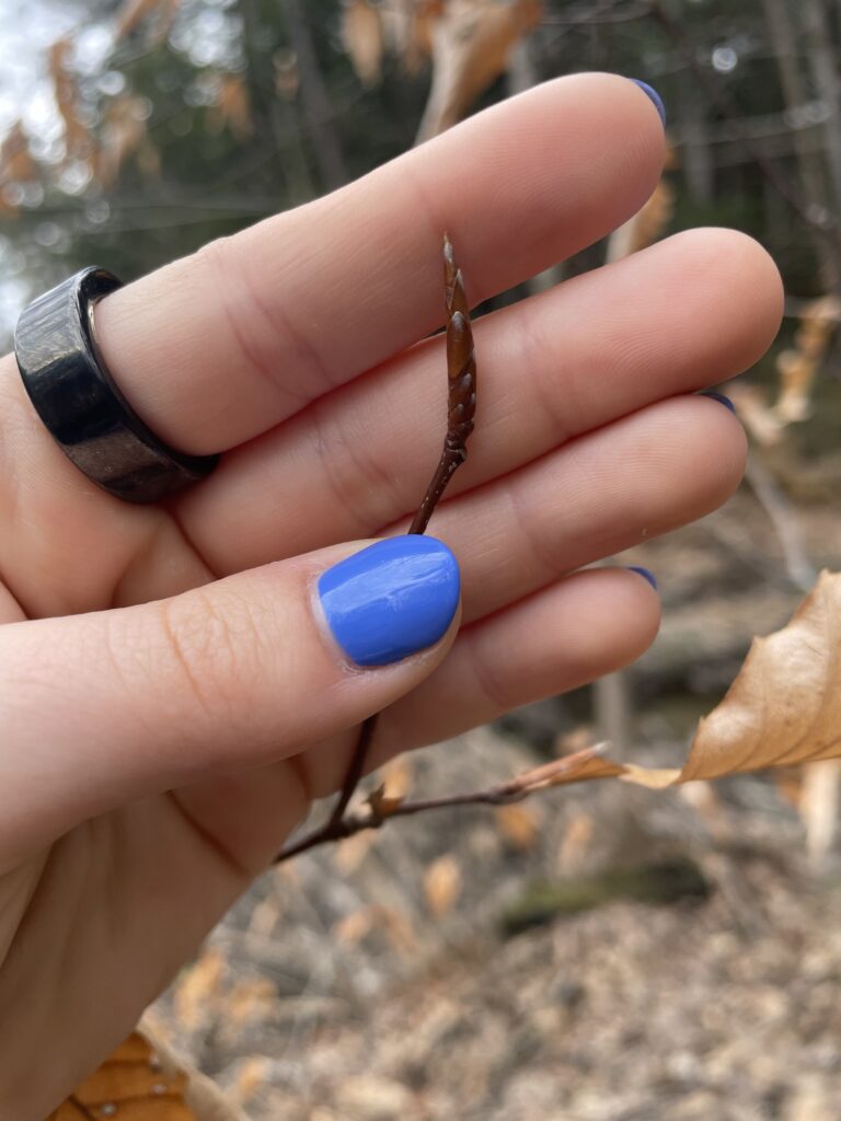 For my blog and iNaturalist post, I selected a young American beech tree in Centennial Woods. The identification process was easy because the tree still had leaves which were clearly the unique beech leaves (egg-shaped with distinct ruffles). If the leaves were not there, I would have been able to identify this tree using it’s twigs. Beech trees have thin, hairless, and true buds with many scales. Additionally, their twigs are very thin with short side twigs.