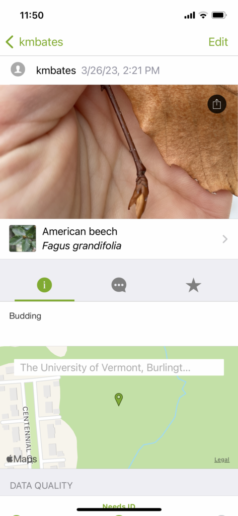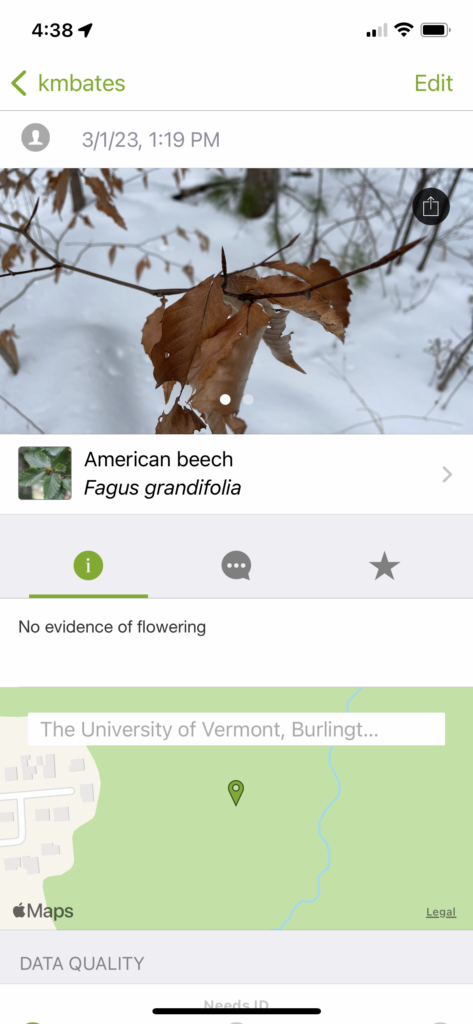 • iNaturalist Experience: Overall, I had a good experience with iNaturalist. However, I wished it included features that were more helpful in identifying flora and fauna species. As someone with little knowledge surrounding Vermont’s many native species, I struggled to identify certain species that we had not discussed in lecture or lab. Other than this, I really enjoyed the app and the experiences it enabled me to have!