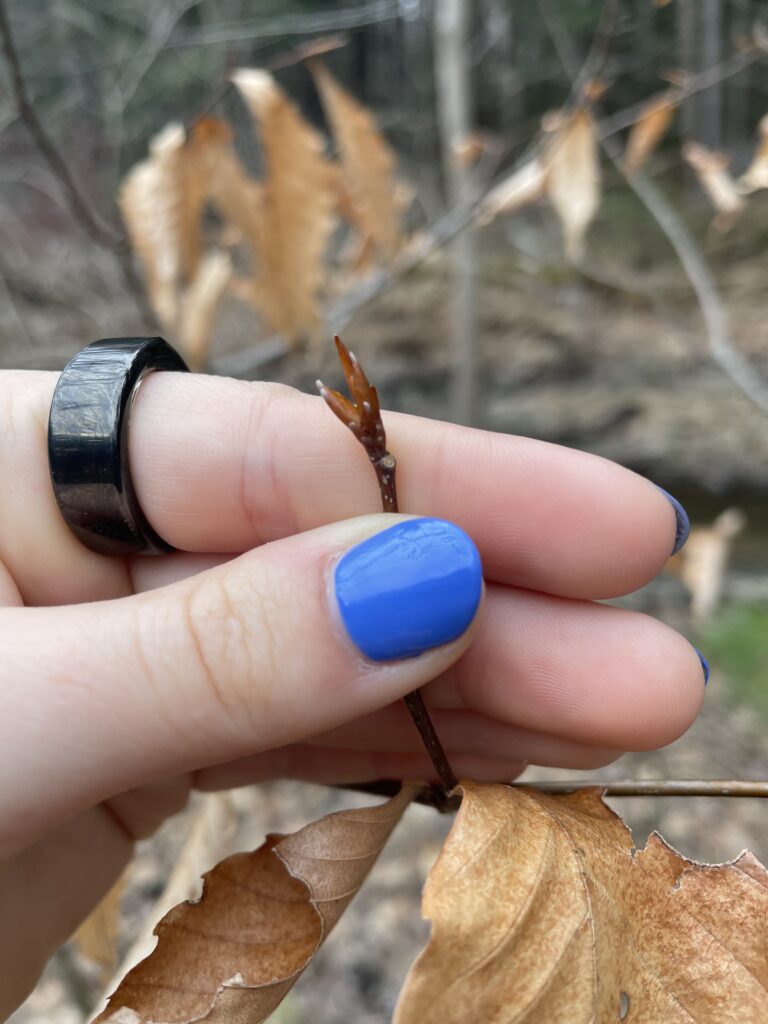 On March 26th, I revisited the American Beech tree I observed prior to spring break. Upon examining the branches, I immediately noticed a difference. Of the two buds I studied last time, one of them has begun the process of budding. Compared to the rest of tree, there were only four others that begun budding.