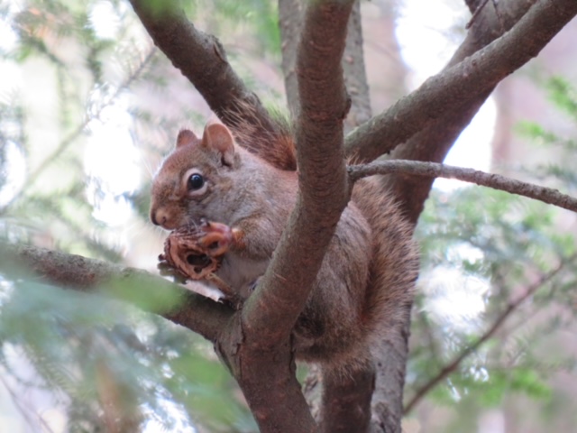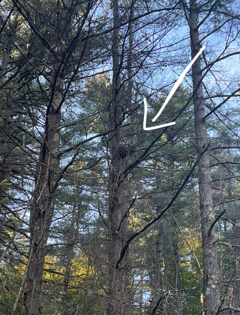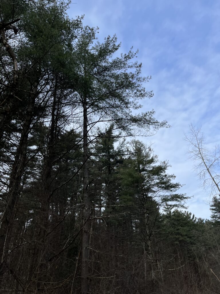 Other things I noticed this time were some of the animal and bird species in this area. There were many birds chirping almost everywhere in my spot, but going closer towards the eastern white pines, there were less. Using the Berlin app, it said there was a House Wren, Pine Siskin, Brown-headed Cowbird, Red-breasted Nuthatch, Dark-eyed Junco, Black-capped Chickadee, Ruby-crowned Kinglet, Downy Woodpecker and a White-throated Sparrow. I also saw two bird nests in the eastern white pine trees on my way to my spot. Other animals I saw were some squirrels running around and some young fish in the stream.