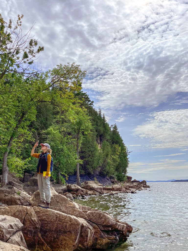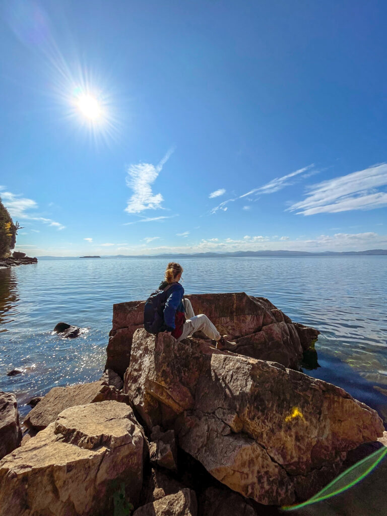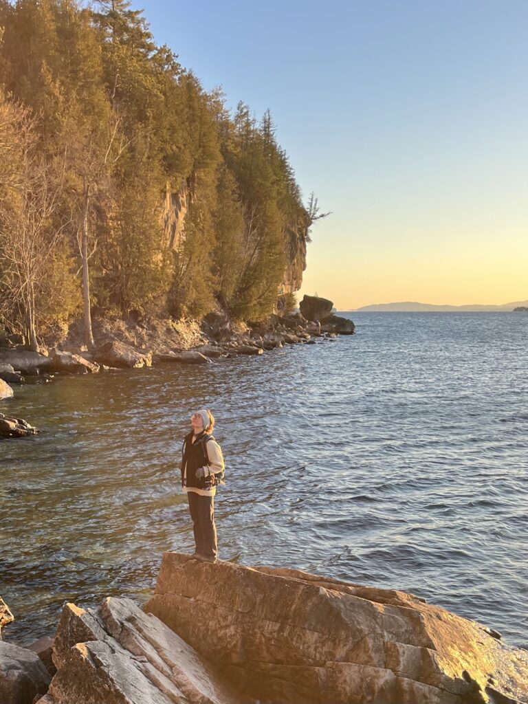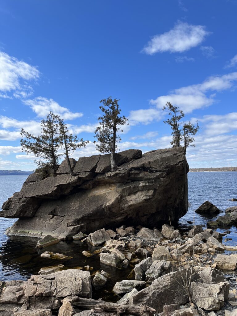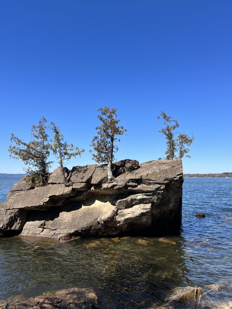 There was one minor landmark I connected with the most. It was a singular chunk of dunham dolostone that was surrounded by water. I liked to sit on that rock through my visits at Rock Point; watching the sunsets and adirondacks across the lake, as well as the movement of trees on Rock Point’s shoreline. It was the place where I felt most connected with this landscape.