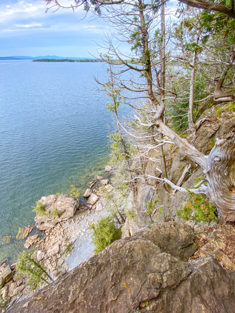 This is Rock Point. Rock Point can be described as a natural piece of art, exposing the ancient geological history of Vermont to present day viewers. To get there, you travel similarly to getting to North Beach in Burlington Vermont. The only difference is, when you reach that fork in the road right after Burlington High School, you take a right instead of a left. From there, you’ll find the “Rock Point” sign at the start of the paved road, and follow the road to a series of dirt trails that lead to the Thrust Fault, and Rock Point’s shoreline. Transportation by a public bus or private car will get you to the top of the fork, however no larger vehicles can pass through “Rock Point” unless permitted to. You can also get to Rock Point by simply walking or biking, as it’s found right off the Burlington Bike Path near North Beach.