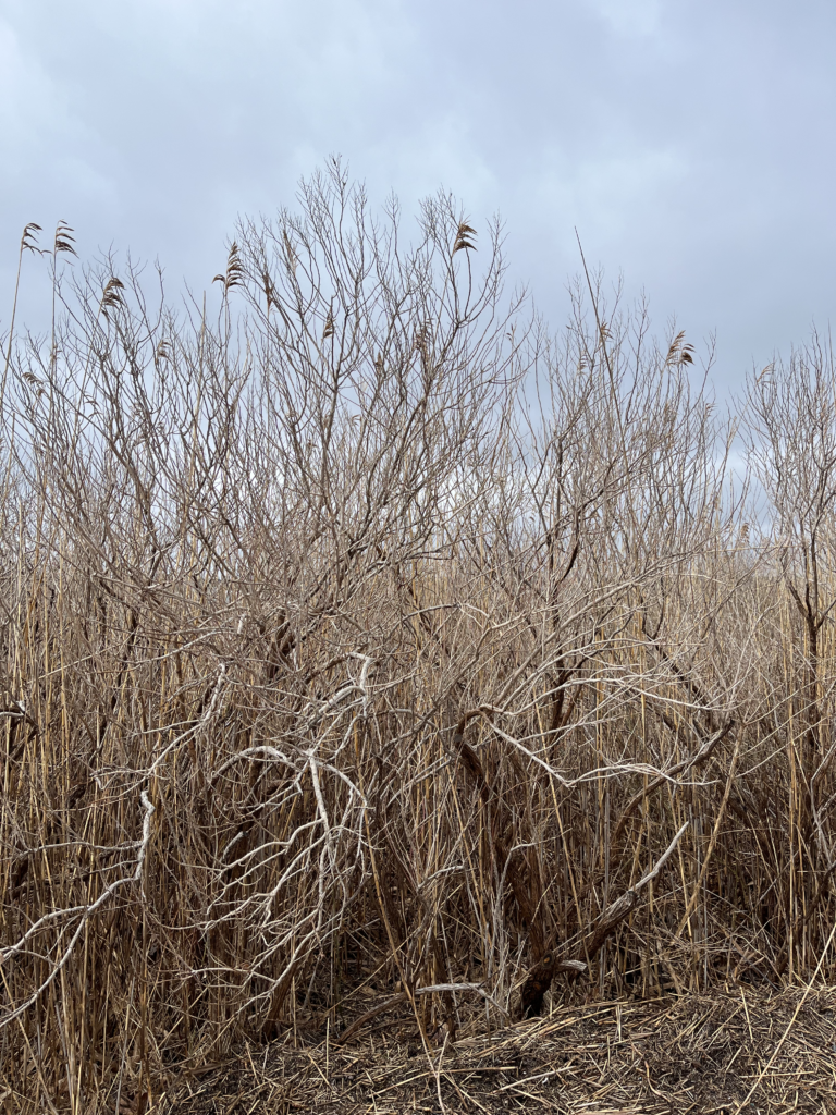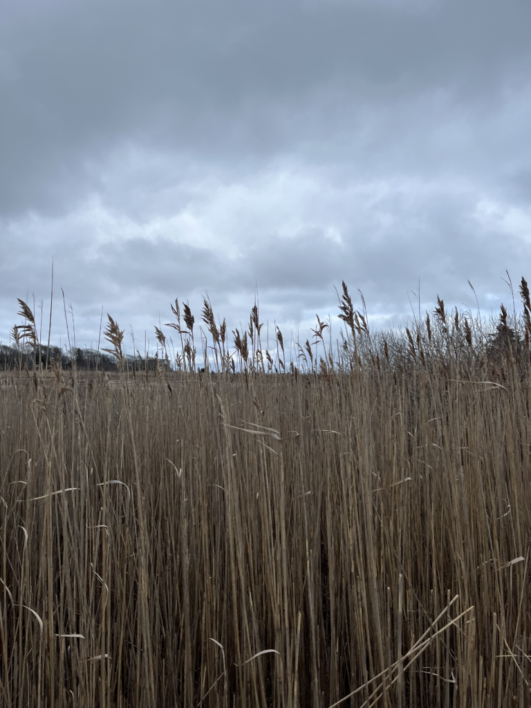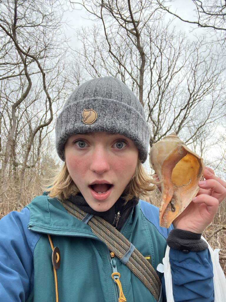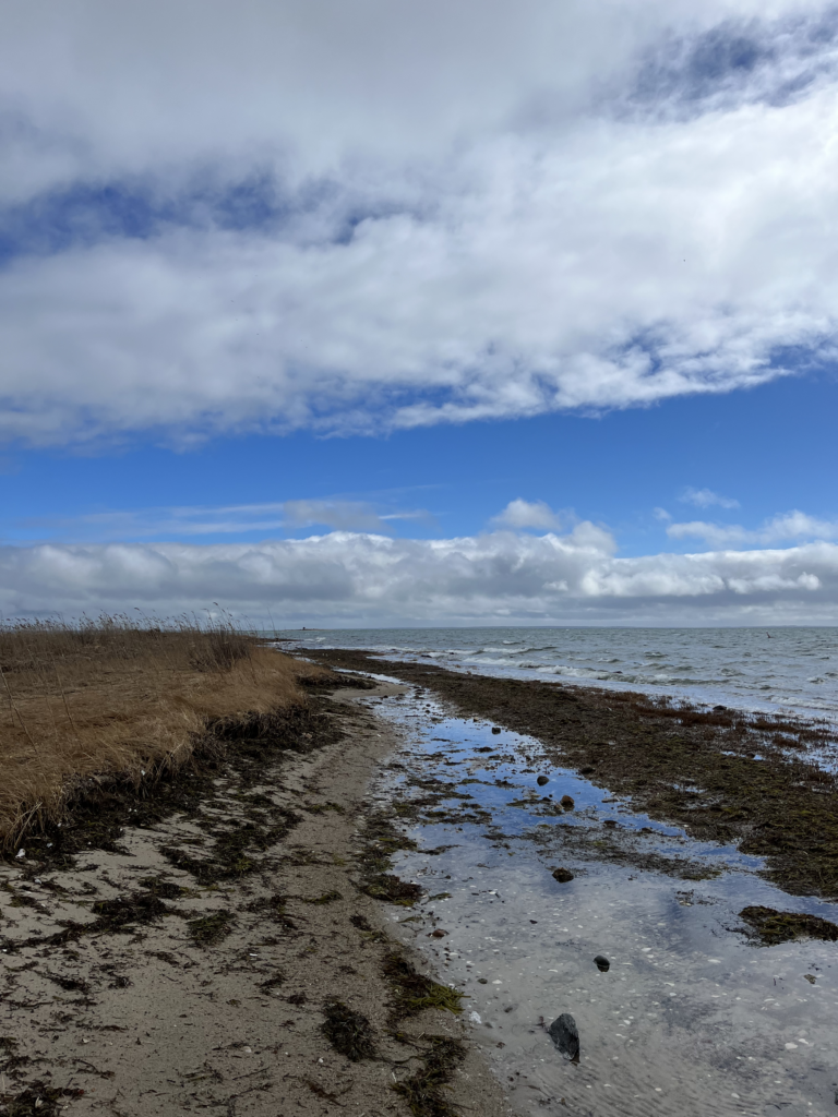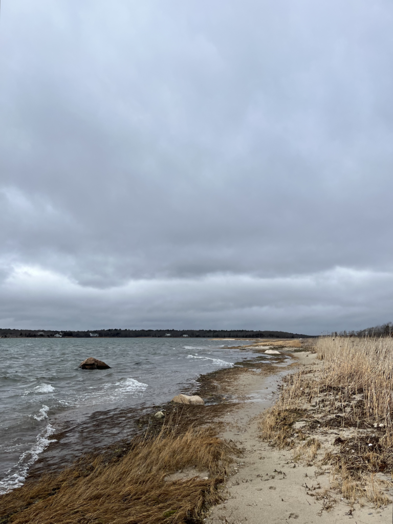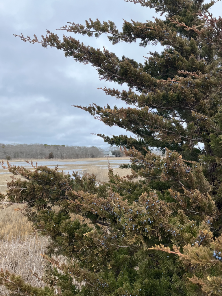 During this particular visit, I audibly encountered the peaceful sounds of the Black-capped Chickadee, the Downy Woodpecker and the White-Throated Sparrow. As for actual encounters, I only came across the White-Throated Sparrow sailing through the air. The main woody plants on this beach are the Atlantic White Cedar, and tall seagrass. The Atlantic White Cedar remains green with reddish-yellow flowers starting to bloom on some of the branches, signaling its reproductionary stage. The tall seagrass is shriveled, dried up and a dull shade of brown. In the springtime, this state of seagrass covers the fresh green sprouts ready to grow out during the summer time. I also could not help but collect a couple seashells as treasures for my bookshelf.