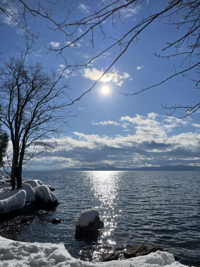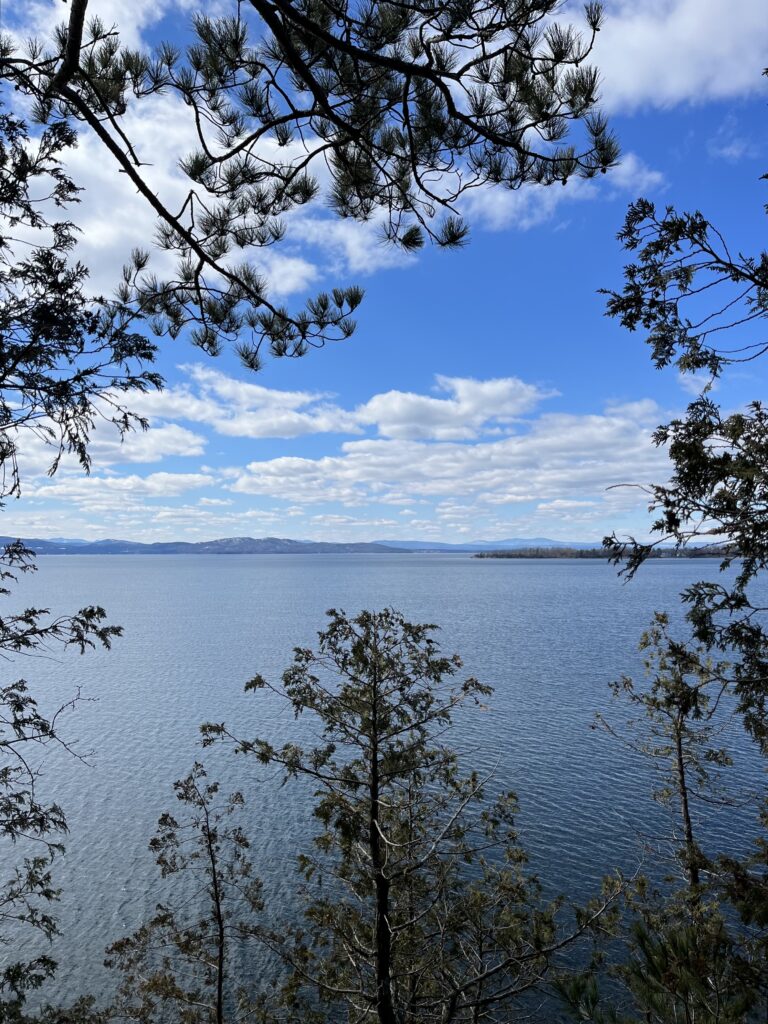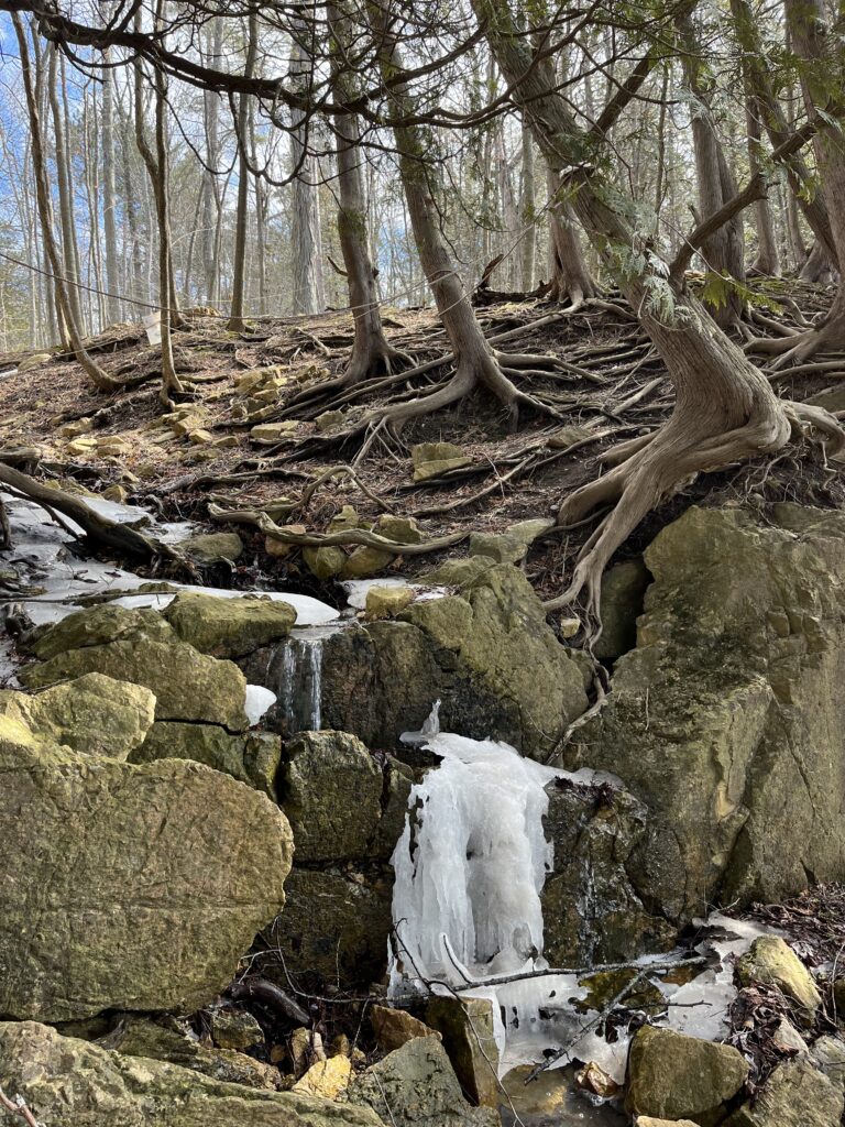 As for visiting my phenology location, I noticed a drastic change in the water’s behavior surrounding my place. Melting snow from atop the reverse thrust fault caused many types of water run offs, including small waterfalls and drippings down the dolostone and shale walls. As for the shoreline, it is loitered with new fallen branches and logs from trees. The water level along the shore has seem to shrink back as well, as there is more land to walk along compared to my last visit in January. There is still a lot of ice along the shore, trapping the shape of the shoreline with the shale rocks frozen in place. One last thing I noticed upon this visit, was the color of the water. Instead of its usual crystal-clear color, Lake Champlain gave off a green tint today. Many of the submerge rocks are covered in this brown-colored bacterial algae, staining the freshness of the lake with its pollening production.