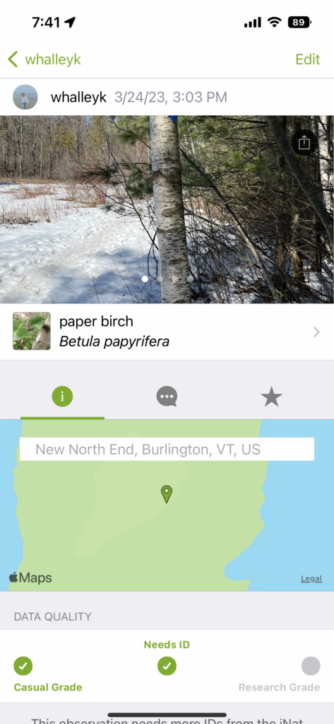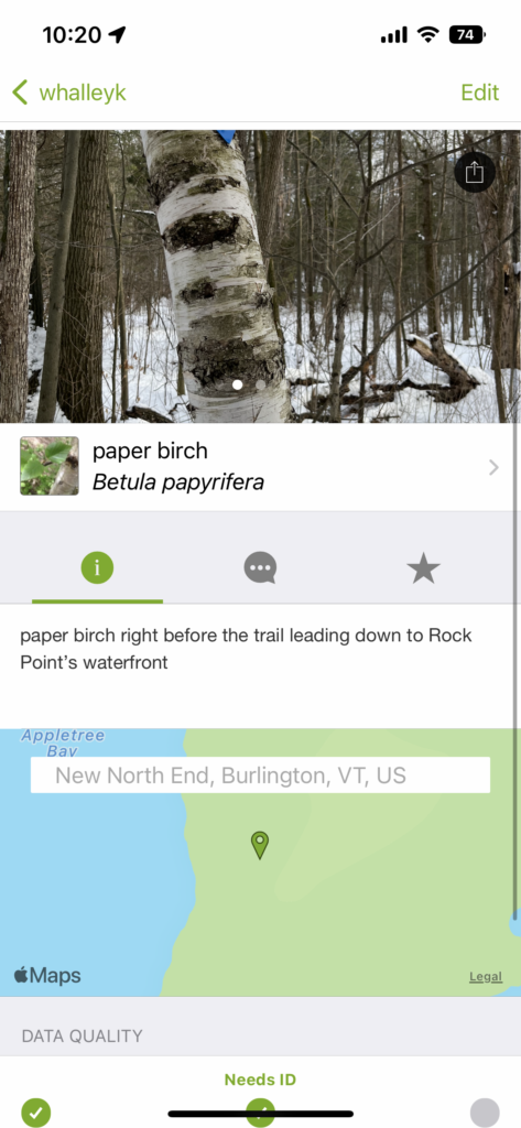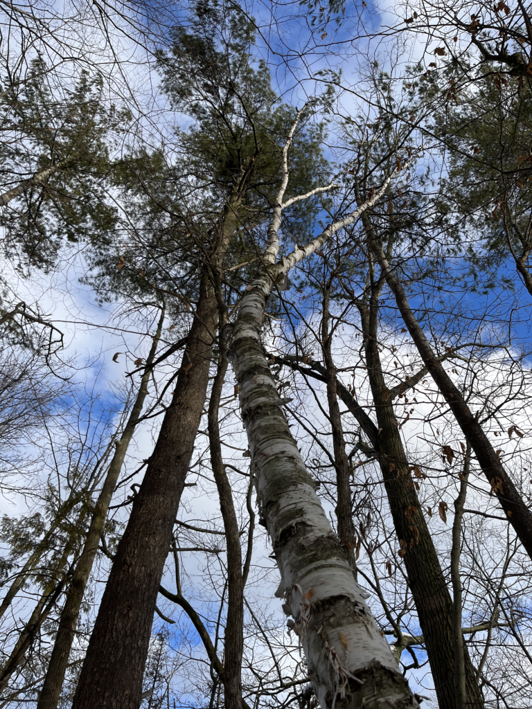 During this visit to my phenology spot, I focused more on the trees in the area. Rock Point is diverse in its trees, with many maples (both red and sugar), oaks, cedars, pines and birch. Today, I focused on a paper birch right before the boardwalk that leads down to the waterfront. I made sure to check that this paper birch was not one of the three lookalikes; either yellow birch, gray birch, or river birch. Most of my identification process for this paper birch was issued around the description of its bark.
