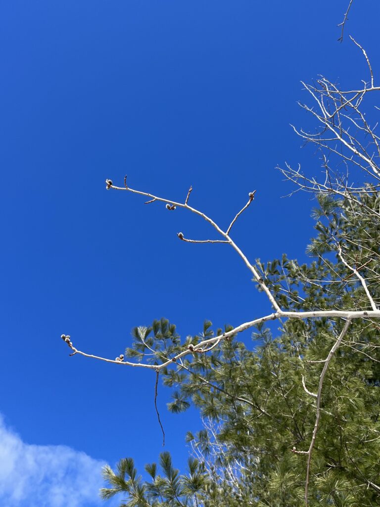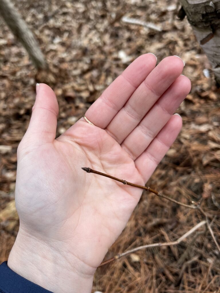 My paper birch tree has not changed much since the last visit I made to Rock Point. This makes sense given it’s only been a week. My original paper birch still stands the same, although there seems to be more rotting patterns standing out against its bark. To me this indicated that the birch tree was dying, and it may be helpful to look at surrounding paper birches for more accurate phenology results. Something else I noticed on this tree was a greater amount of peeling occurring on the tree, as spring is the given season for paper birches to start “shedding” their bark. I was not able to see the buds of the birch’s crown, as it blended in with the crowns of its neighboring pine trees. But, there was a birch sapling growing at the bottom of the tree, so I looked at those buds that were still dormant. I visited the second birch tree I saw last trip, and there were some tiny blossoms from the highest branches. The rest of the buds still remained dormant.
