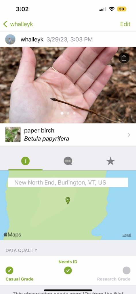 The original paper birch I focused on appears to be dying, as the health condition of the tree itself was evidently deteriorating. In order to continue an accurate observation of the phenological changes birch trees experience, I found another birch tree. This one, though very young, was exempting characteristics not present during my last visit. Looking up at the buds I noticed there was some catkins starting to break out in the tree’s crown. It is very subtle growth, but the buds that lay dormant my last visit are starting to break and carrying out soft fur-like heads.