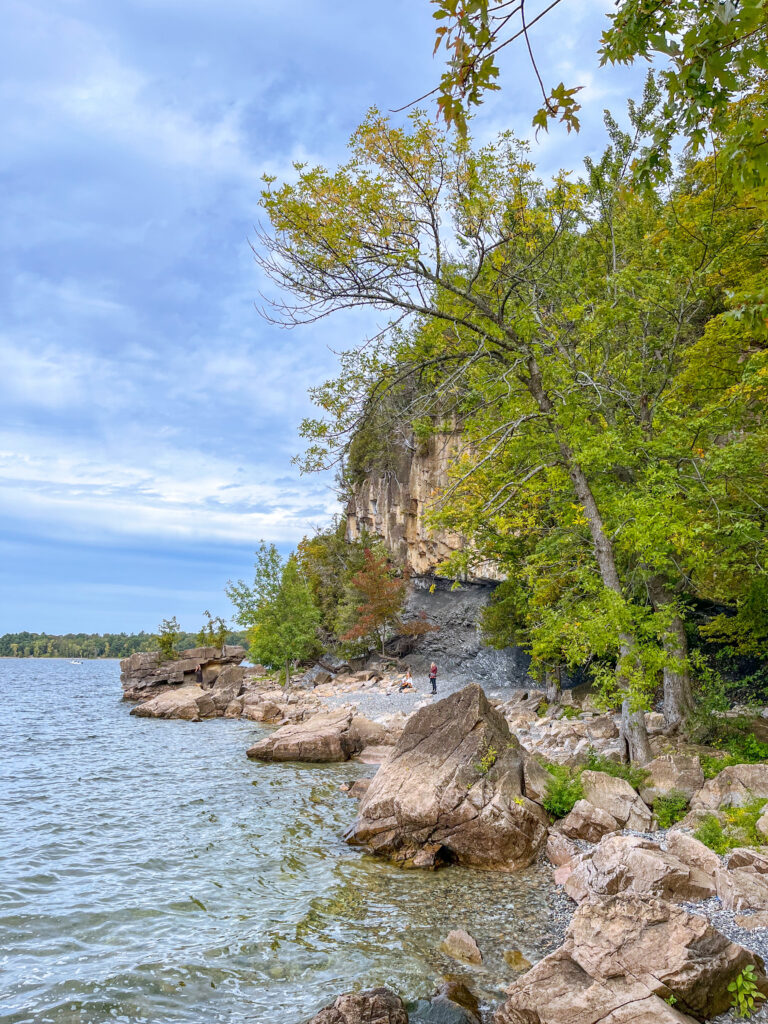 The vegetation growing throughout Rock Point is heavily influenced by the unique reverse thrust fault that occurs within this beautiful place. The dolostone and limestone bedrocks, saturated with calcium, amplify the presence of calcium in the soil above the rock. Northern white-cedar, together with white and red pines, are the most prevalent trees in the Limestone Bluff Cedar-Pine Forest, which dominates the area along the Rock Point peninsula. Directly on the shoreline, the vegetation is quite bare for the crumbly pieces of Iberville Shale. A mixture of White Ash, Red Maple and Red and White Oaks grow at the base, climbing up the steep slope to above the thrust fault. What is so interesting about Rock Point, is the Northern White Cedar growing off of the Dunham Dolostone rock, not just at its base but on cliff points. Above the thrust fault, the herbaceous layer of Rock Point consists of few ferns, wildflowers and a lot of fallen trees. The understory of Rock Point is a varying mixture of Red and Sugar Maples, American Beech, Paper Birch and Honeysuckle and Buckthorn. The overstory consists of Northern White Cedar, Red and White Pines, White Oak and mature Paper Birch.