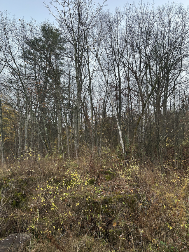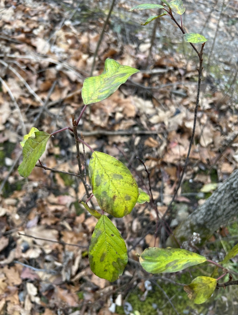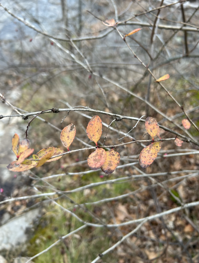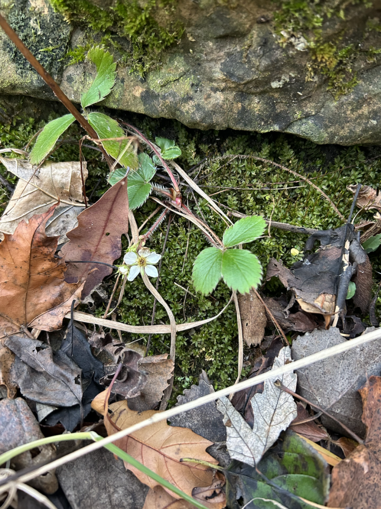 Coming back to my spot, I noticed significantly less green. In november, most of the leaves had already dropped, but there were some trees that still had leaves. Now, the only green that I found was Alder Buckthorn, moss, and Coralberry. The Buckthorn still has some green leaves. The Coralberry has brown leaves as well as some red berries. I also found a singular strawberry plant! The only trace of animals I found was some bird poop on the rocks.