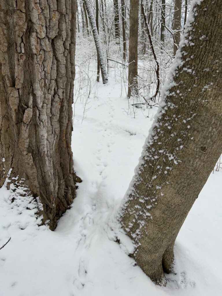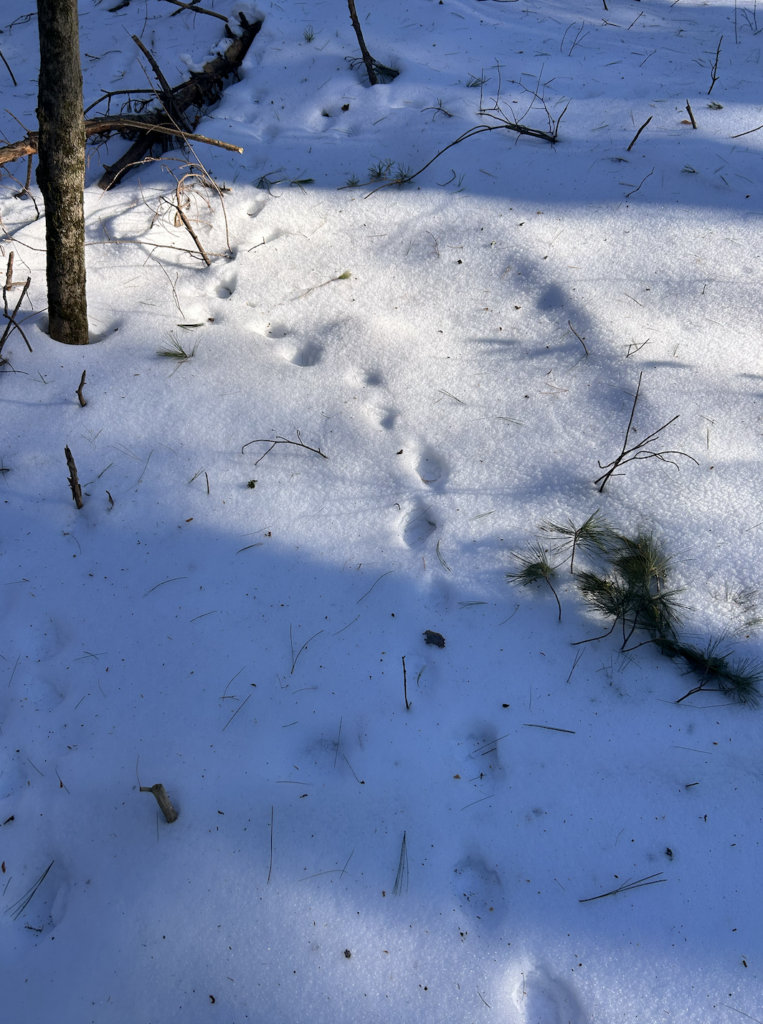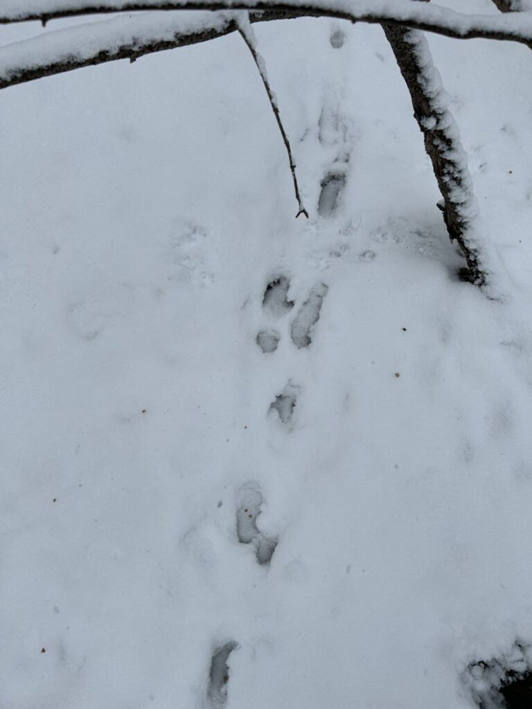 I visited my sight right after the snow storm, making it look like a winter wonderland. Fresh snow covered all of the plants and any remaining leaves on the deciduous trees have since fallen. The river had a layer of ice on top but it was very thin due to water movement. Down the bank a little bit there was no ice because the water moves too fast for it to freeze over. I found some tracks that I believe are from a rabbit but also could be a squirrel. It was hard to tell because it snowed a little bit on top of the tracks.
