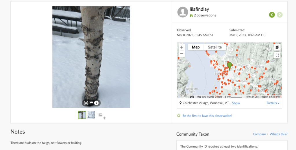 I found these tracks in centennial woods. Since the snow was beginning to melt it was difficult to determine what the species was, but based on the walking pattern being diagonal and the size of the print being around an inch and a half, I am hypothesizing it to be a gray fox. iNaturalist was unable to identify it because the prints were not distinct. It could have also been a red fox because they have similar tracks, but I went with gray fox because the toes seemed a little bit wider, but I am honestly not sure. Uploading to iNaturalist was very easy and straightforward. It is cool to see everyone elses observations as well!