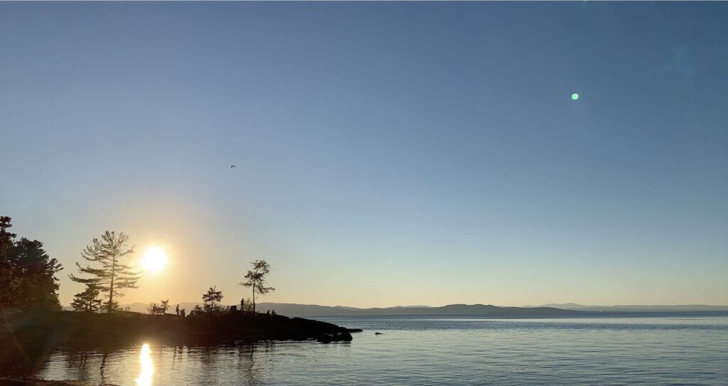 At the base of this treehouse, is a path through the woods. Continue down this path, and you will reach Lake Champlain and its rocky bluffs.