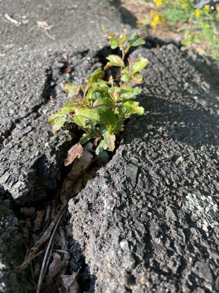 The first is the cracked and weathered pavement with plants erupting from and thriving within the cracks.