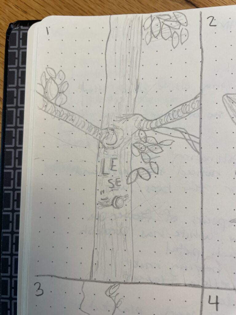 The third is carved initials in a tree, a sign that will remain throughout the tree’s life that this environment has been altered by humans, a small sign of much larger damage.