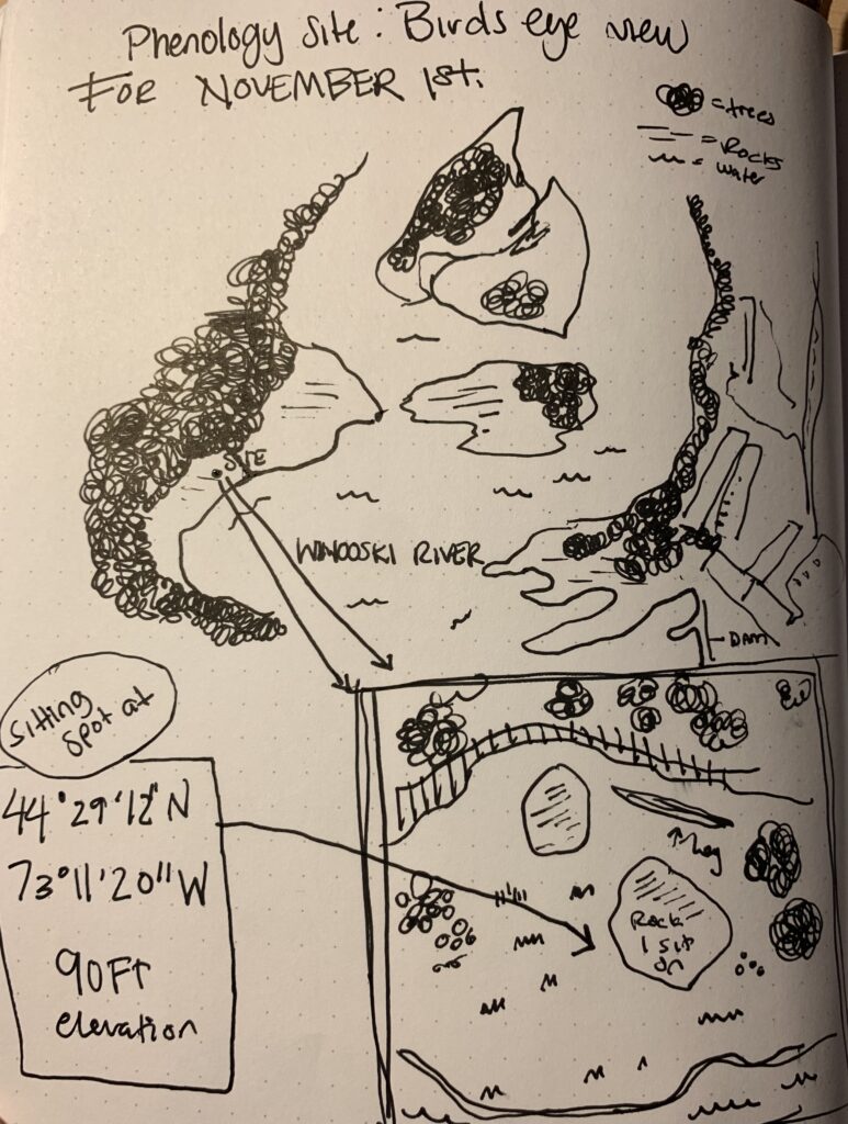 while sitting at my phenology site today I found the water to be very nice to watch. Due to the recent rain the past week or so Winooski River was super flooded, spots that usually have visible rocks, plants, grasses etc. were completely underwater. At the dam above the water was had so much water rushing out of it I kept thinking it was going to break. at the salmon hole the water was moving in a way that was very interesting to watch and at one point i thought a whirlpool was forming. Something i also noticed was the amount of bubbles and foamy buildup in the water. I was wondering about whether that was caused by the motion of the water or by pollutants. the leaves are different than they were on m last visit. all the trees have turned and are loosing the last of their leaves. There was also less people around today but more garbage left around. I saw a lot of wrappers and bottles around. I think on my next Ill do a cleanup.