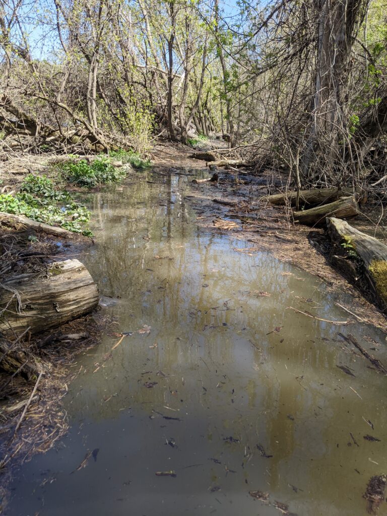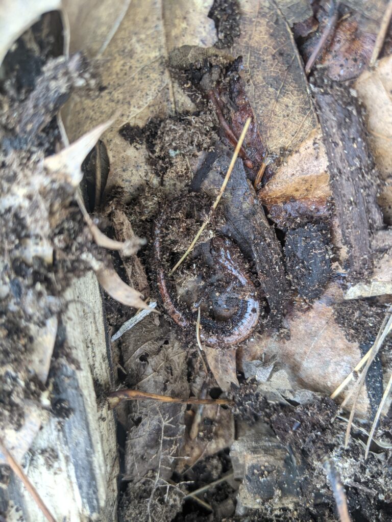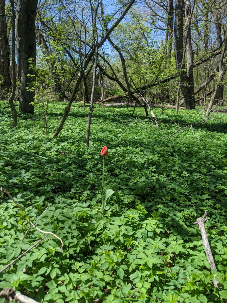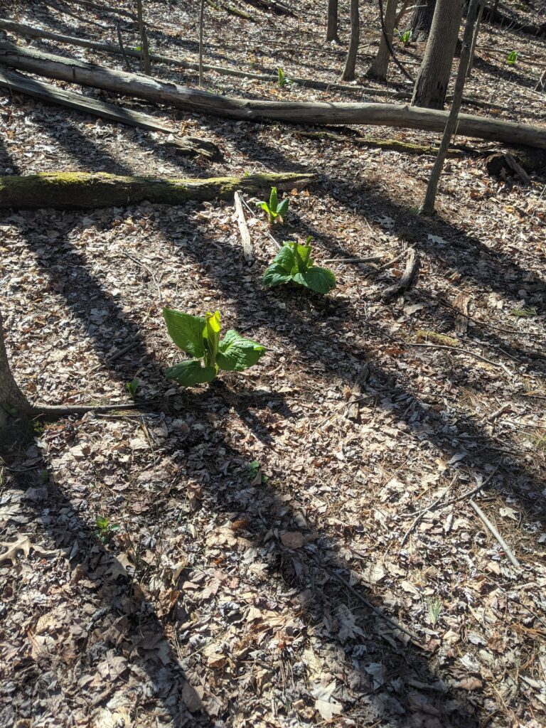 There was an incredible amount of change in this last visit. Everything is turning green!! Most understory trees are leafing out and the empty space of leafless trees are starting to fill in. There is also a lot of ground level herbaceous plants such as ferns, horsetails, flowers, and other kinds that I did not identify. There wasn’t a huge increase in wildlife activity that I was able to notice. However, there were a lot more insects out such as various flies, bees, and other kinds. I also saw a garter snake which was super cool. It was oddly calm around me and Emma. We got really close to it and it didn’t slither away. We were thinking about trying to pick it up but figured that might be a bad idea. The it seemed like the oak trees are a little later to leaf out, as the only trees I really saw leafing were beech, maple, and I think it was an ironwood. There were also some beautiful flowers such as a Jack in the pulpit and red columbine.