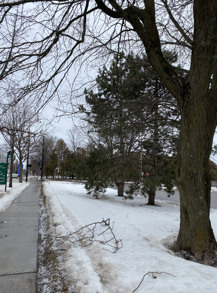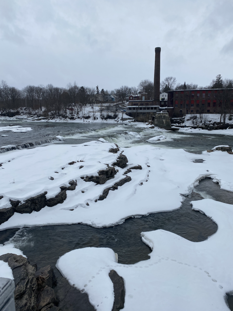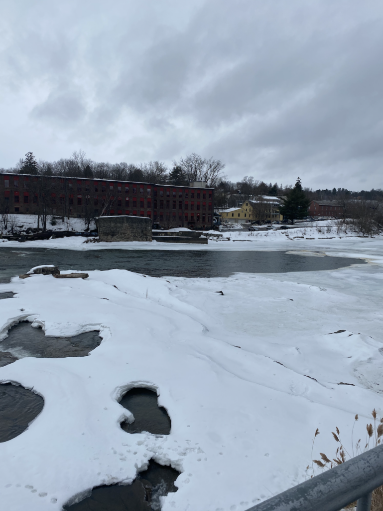 I explored the city of Winooski this past weekend. I chose to look at Winooski instead of Burlington because I have walked around Burlington countless times and I thought it would be interesting to see the Winooski river. The main thing I noticed was how the rover was partially frozen and partially still rushing. It was interesting how the ice formed in specific patterns along the edge of the river. I also noticed some sort of animal tracks on the ice but could not quite make out what the animal was because it was so far away. The main takeaway from this walk was that everything was much icier than snowy at this time. It even started to rain during my walk which meant that it wasn’t even cold enough for snow. Something interesting I’ve noticed this month is that sometimes in Vermont when the sky is cloudy it seems as if the world is in black and white. Not saying that that is a bad thing, just thought it was an interesting phenomenon.