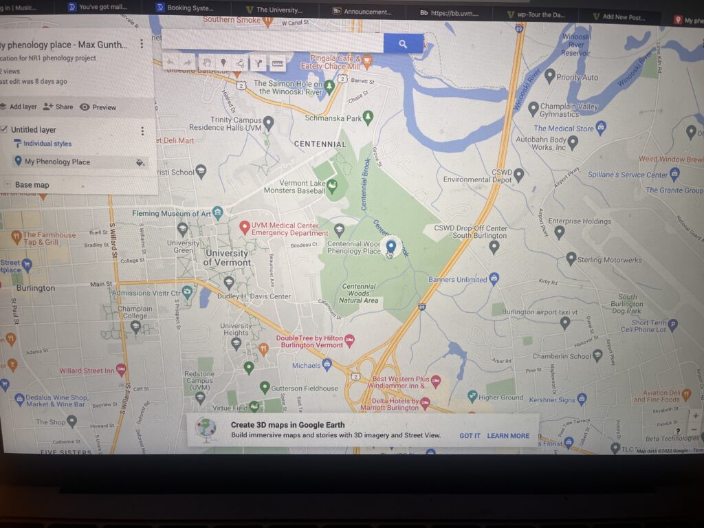 The most relevant major landmark would be the large retention pond right outside the red stone woods. It is the most relevant in my opinion due to its implications within the larger Burlington and lake Champlain environments. The most noticeable minor landmark would be the large fallen log (appears to be a large oak) right in the middle of my site.