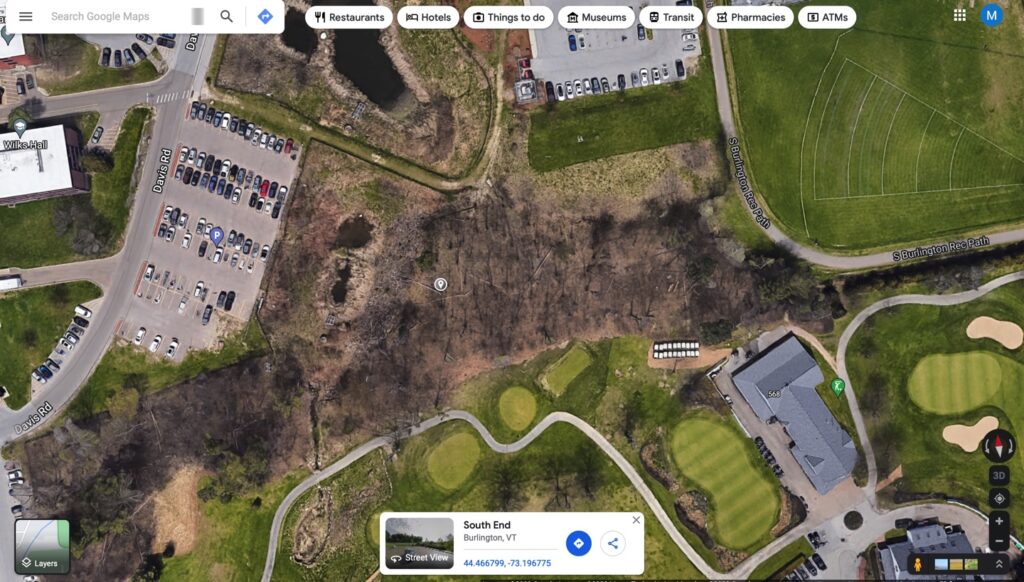 Nature and culture interact quite often here with the UVM students and Burlington locals who walk, hammock, and hang out within the woods. It also is a literal and metaphorical border between the culture of broke UVM college students and the high echelon country club on the other side.