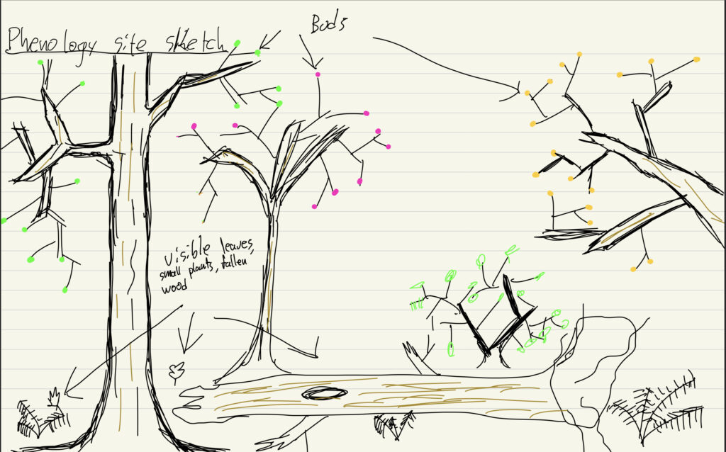 Compared to the beginning of the semester, my site looks widely different. For starters it was the dead of winter when we started and the ground was covered by a thick blanket of snow. The trees were completely barren as well. Now the trees and other plants are full of buds that will soon become new leaves, filling the forest with green. Looking and listening around my site I noticed a massive increase in animal life as well. The winter season changed the topography of the ground due to the massive amounts of snow that we received. This snow eventually melts and when it does the water has to go somewhere. Some of it is absorbed by the ground with the rest running towards the retention pond, forming deep ruts along its way.