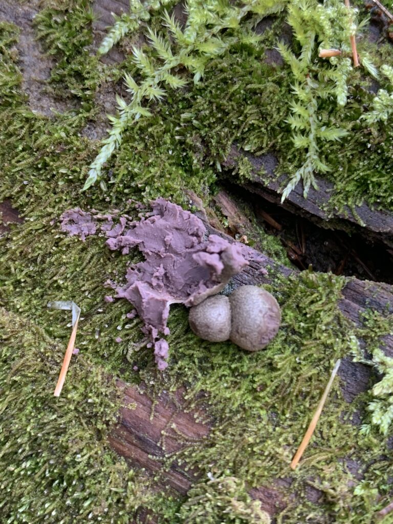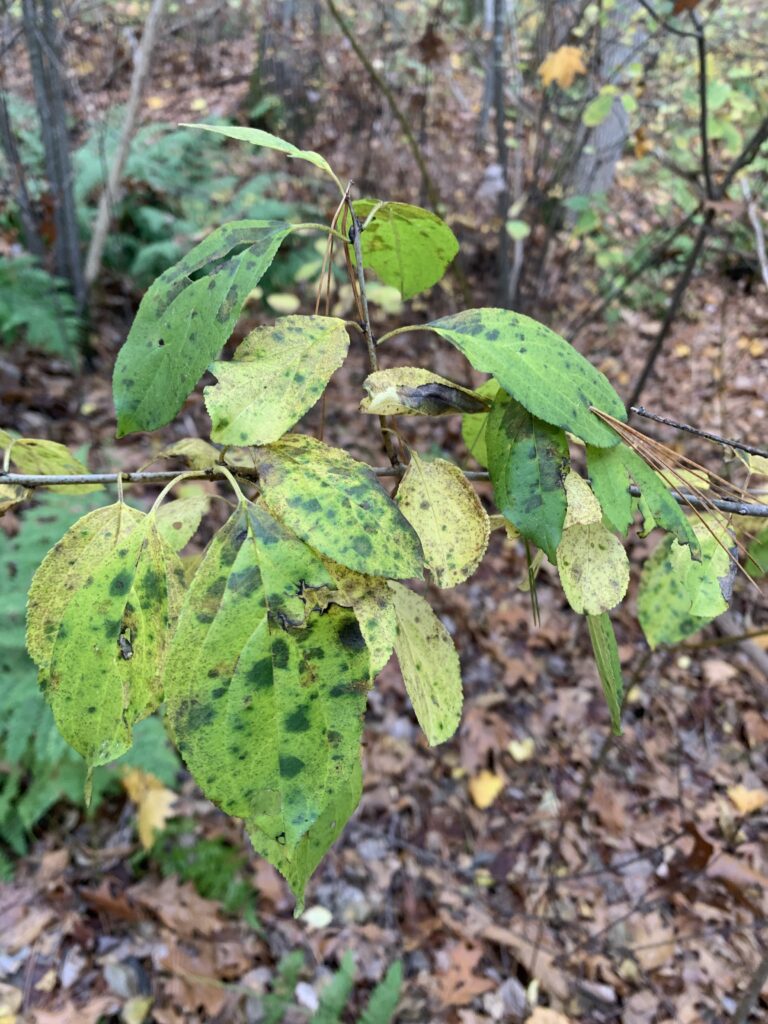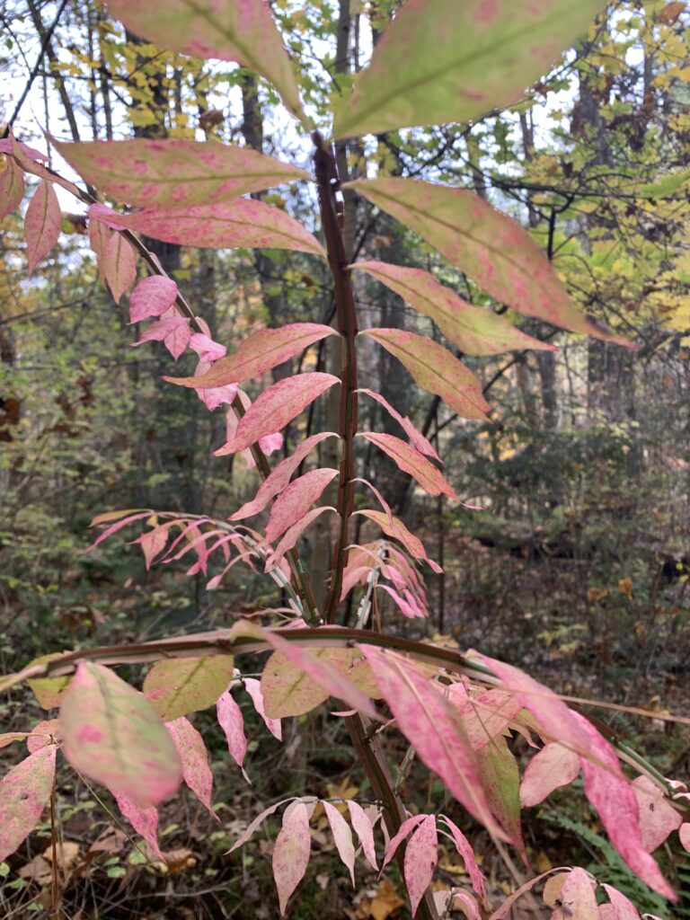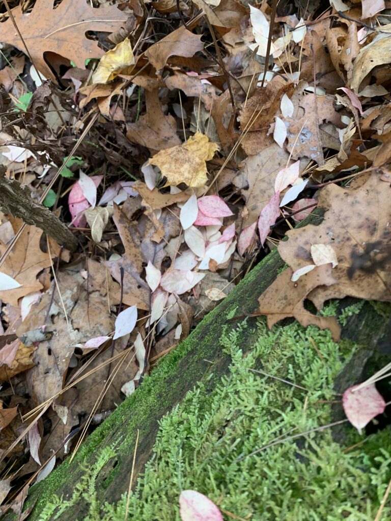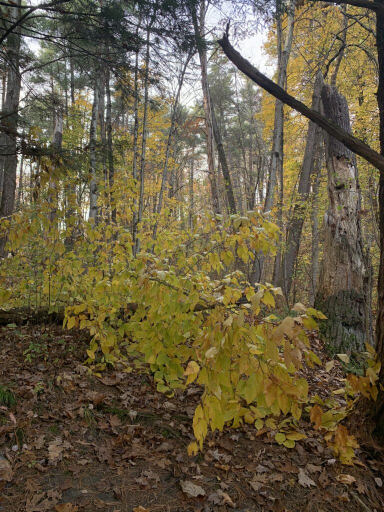 Sights: The dominant color in the forest is shifting to brown as fallen leaves carpet the ground. Yellow accents are found in the few leaves still hanging on (namely the American Beech and Norway Maple). Pops of pink from sugar maple saplings and invasive burning bush add some excitement, and the wolf’s milk amoeba has turned to a beautiful mauve. Due to the abundant ferns, moss, evergreens, and buckthorn, even some green is still present.