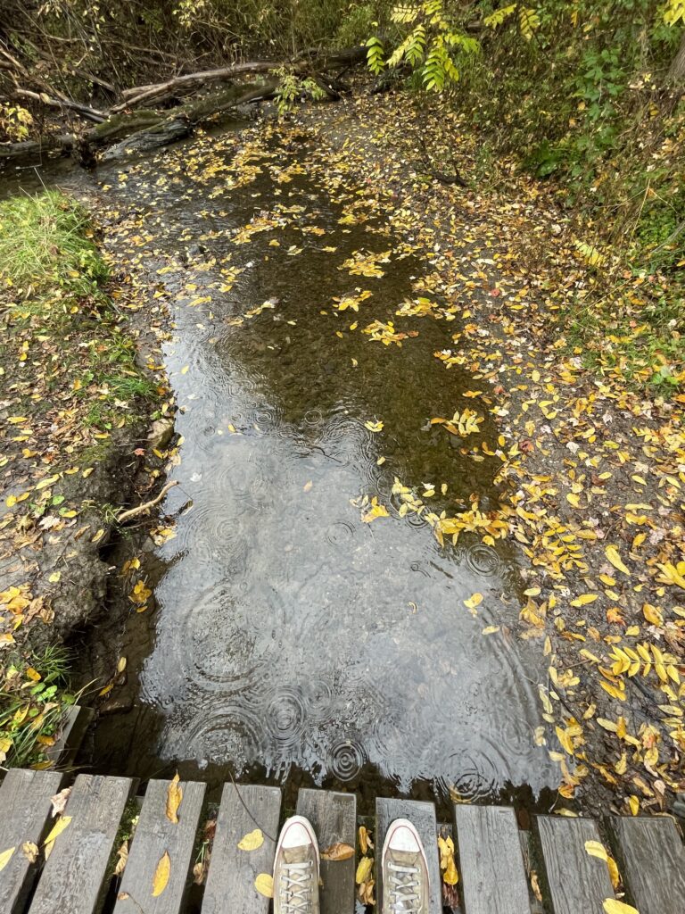 17 October 2022: Welcome to my blog! I’m excited to share my observations and updates with my phenology spot. Today, I biked to my spot in the pouring rain to gather my notes, the trail turned to mud as I made my way to the brook. The brook was fast-moving due to the heavy rain with lots of surrounding vegetation and fallen leaves in the water. I heard many birds chirping in the area as I walked to my spot; leading up to the brook I walked along a series of small bridges that allow you to cross the muddy trail. Surrounding the brook, I observed the biodiversity of the area; Lots of tall grass covered the ground along with a Red Maple tree close by and three Walnut trees in the understory. An abundance of Eastern White Pines appeared in the overstory, providing a good amount of coverage from the rain. When it comes to human interaction, many people use these woods as a place to, hike, run, and even bike. My goal is to hopefully maintain the land to prevent any kind of pollution and keep it as peaceful and biodiverse as possible. I would love to test the water and soil quality of the area to get a better understanding of the effect humans and pollution have on it. I’m excited to see the progression of this phenology spot as we move throughout the year.
