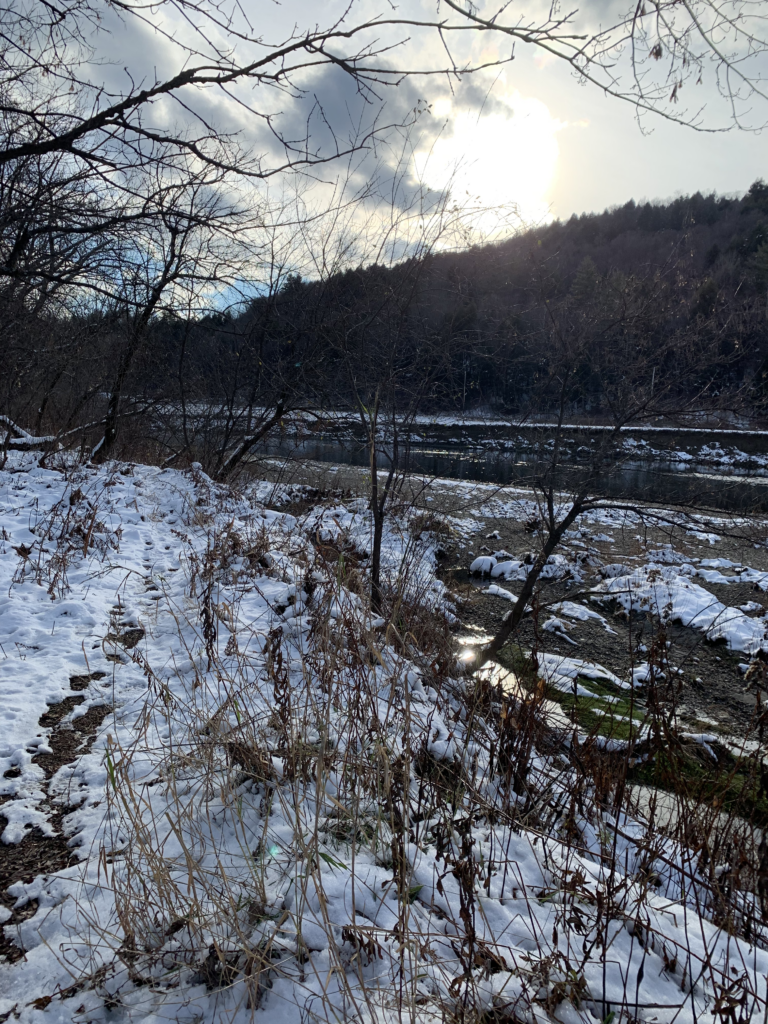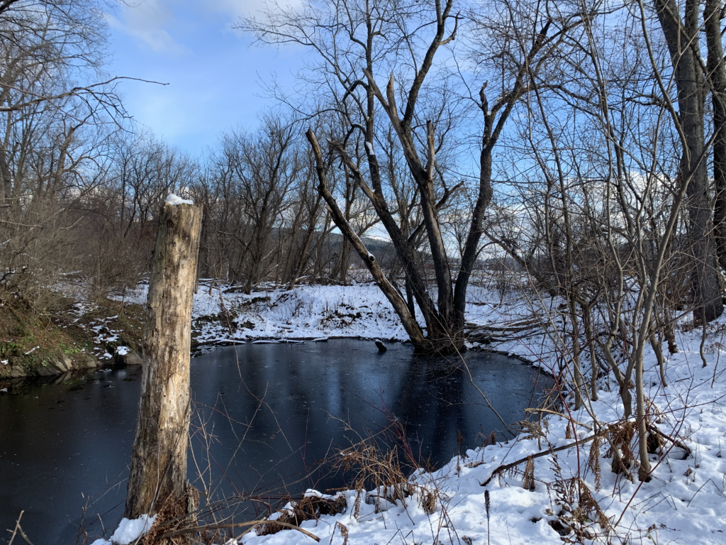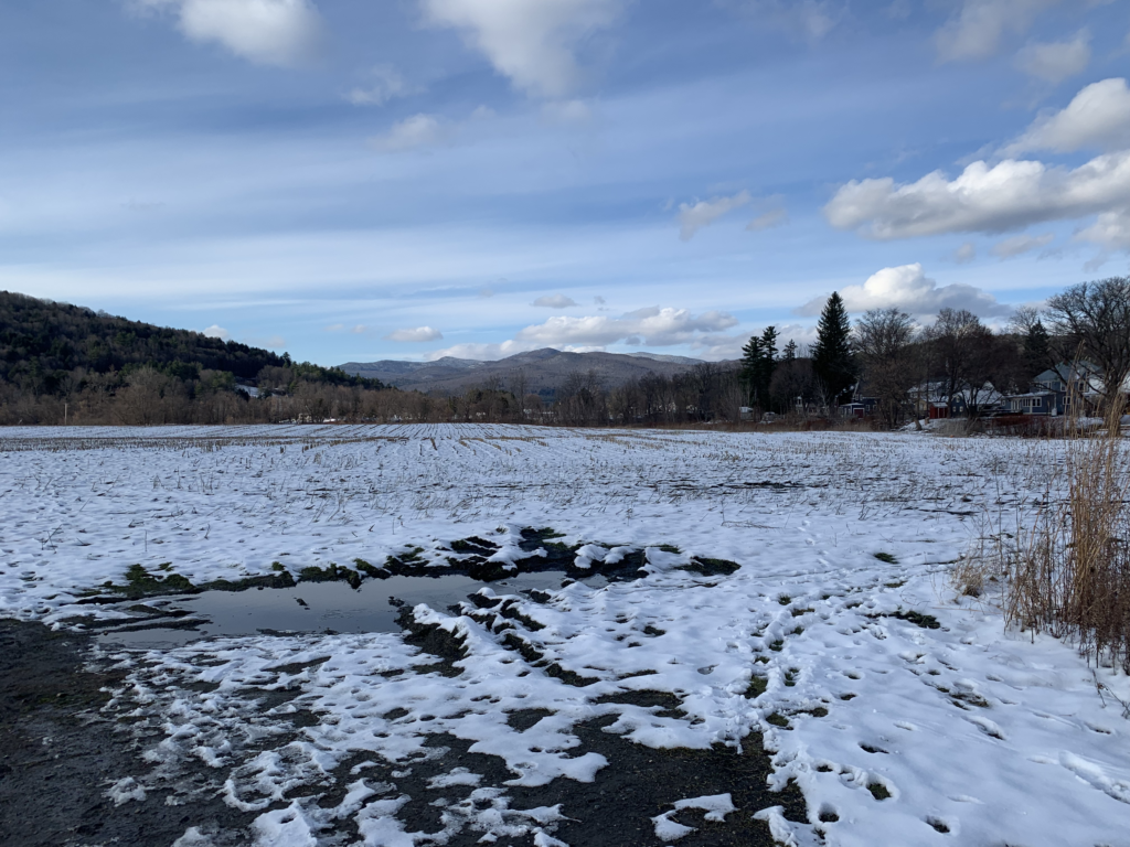 Since the last time I was home in August, the land has changed significantly. The thick green vegetation has been reduced to sticks. What once was grass, now has a patchy layer of white snow covering it. The temperature has also dropped. When I stepped onto the field, I immediately felt the presence of winter through the frigid gusts of wind. While on my walk I noted that the main tree species were Sugar Maples! Some other things noted were lots of dog tracks in the snow and some trees growing in an area flooded by the winooski. I imagine that this flooding is caused by a lack of trees surrounding the river. Trees take in water through their roots. Removing them causes flooding and reduces soil security which leads to erosion.