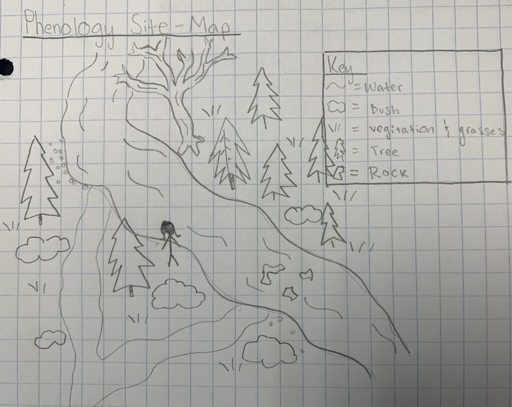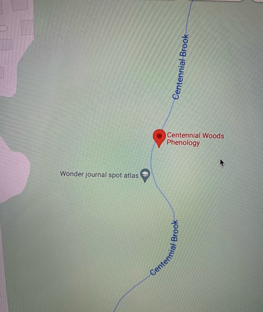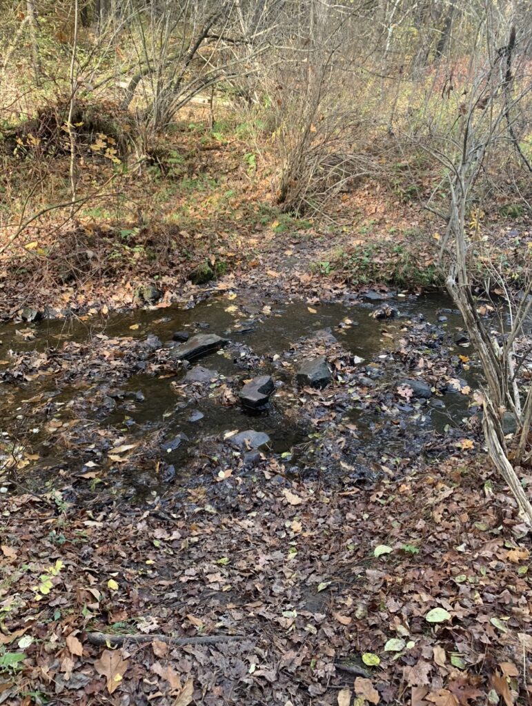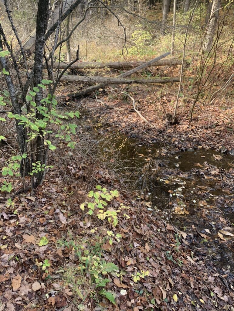 This past Saturday, I took a walk in Centennial Woods and visited my Phenology site. From my first visit in early October to now, I have definitely noticed changes. The most obvious phenological change was the lack of leaves. As we enter stick season, there are few remaining leaves. The lingering pockets of foliage continue to show vibrant red and brown fall colors. This time of year, deciduous plants have begun to shut down in preparation for colder months. These plants absorb as much energy as possible from fading leaves to conserve resources. The nutrients is stored for later use in their roots. A small Norway Maple at my site displayed beautiful golden-yellow leaves. Since my last visit, I have also noticed some significant changes in vegetation. There was a new blanket of fallen leaves that had not covered the ground as heavily in October. There were also far fewer bushes and shrub-like plants in the understory. I noticed a bit more mud and wet moss in the surrounding areas of the stream, likely due to the recent rainfall. The water in the surrounding stream was much colder due to the recent drop in temperatures. After sitting at my site for fifteen minutes I noticed that there was a lack of wildlife. I only noted a few water bugs in the stream and birds passing by overhead. I think that this is most likely due to my phenology site’s proximity to urban development. There is a small town directly up a hill beyond my site.