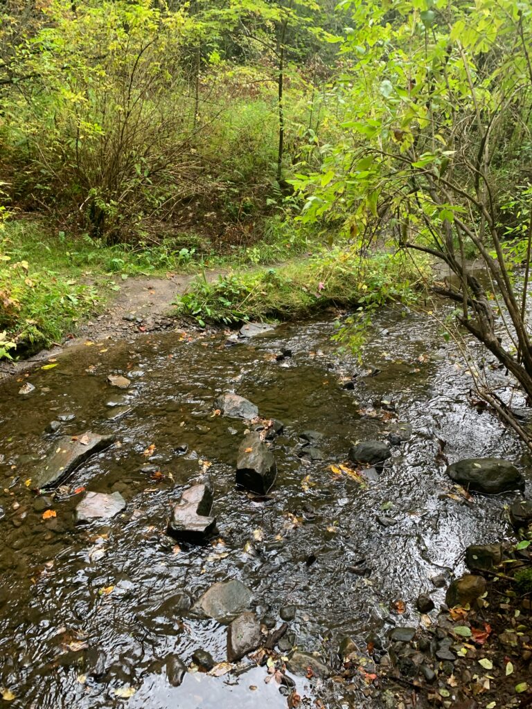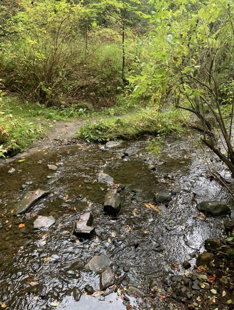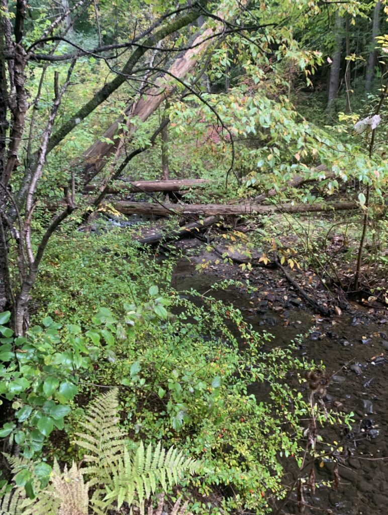 My phenology place is about a five minute walk beyond the trailhead of Centennial woods. It can be found by passing the evergreen clearing, and the bridge over Centennial Brook, in the crossroads opening. My place is down a slope, where Centennial Brook runs along a small trail. Here, small bushy vegetation and fallen autumn leaves surround the stream. The sound of the shallow water crashing against rocks and frogs croaking can be heard. The change in seasons can be seen in the leaves which have begun to change into shades of red and orange. The vegetation here is dense as bushes and smaller plants compete for sunlight under the larger trees above. Some of the plants and trees identified include, a lady fern, barberry bush, paper birch, black cherry, red maple, and a yellow birch! During the first Centennial woods self guided exploration, I stumbled across this spot. I remember it being a lot hotter and sunnier then. Overall, I chose this place for my project because It felt like somewhere I would be happy to return over the next few months. While nature is abundant in Vermont, it is not very accessible to students who do not have cars. This makes the preservation of Centennial woods all the more important. Most of us are aware of the effect that the natural world has on our well-being. Spending time in nature can be incredibly calming. Being in natural spaces such as Centennial Woods is an escape from the stress of school. However, the health of the woods is threatened. 67 acres of this site have been permanently protected by UVM and the Vermont Land Trust, yet much more of this sensitive area remains largely unprotected! Stormwater has caused bank erosion and pollution in the centennial stream which runs through my site. Stream morphology shifts more radically in response to the stormwater inputs, impacting channel stability and water quality.