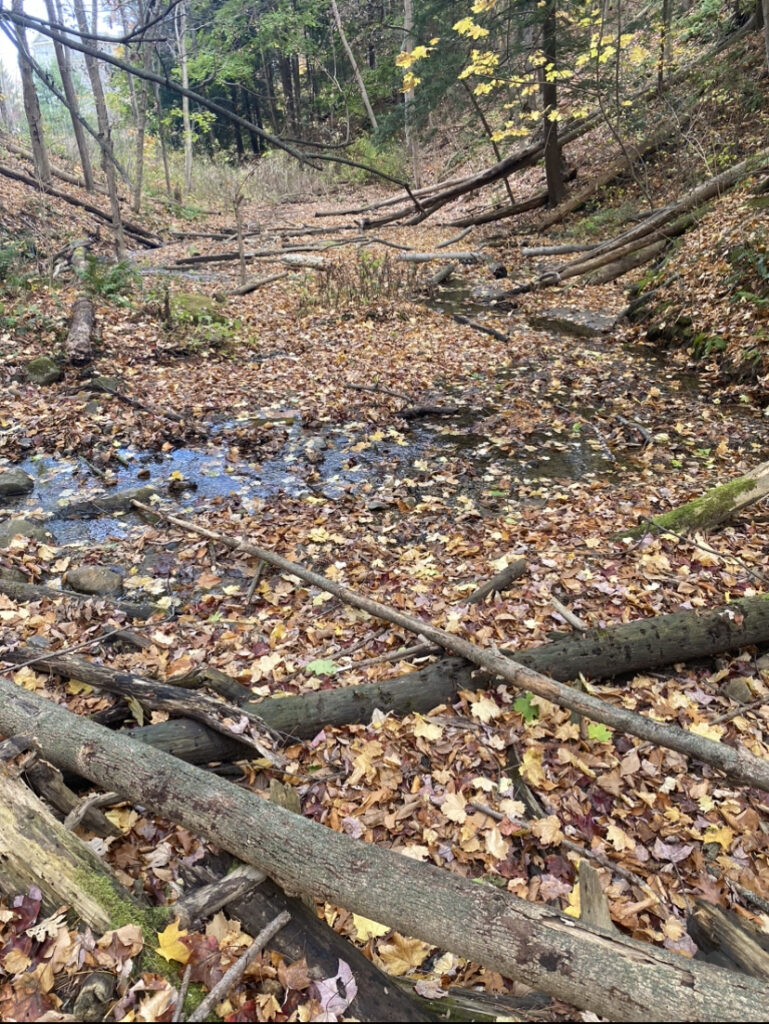 The setting of Trinity Woods remained mostly unchanged as of right now, but it’ll start to freeze soon! Compared to my last visit, the water level of the stream significantly decreased because of the lack of recent rainfall. The understory was covered with fallen leaves and foliage, and the number of fallen trees had drastically increased, likely due to the high wind speeds last week. During my fifteen minutes of observation, I found it difficult to tune into the natural environment’s sounds as construction overshadowed it heavily. The views remained beautiful, even being that the trees are far more barren than before. Also different from last time- the amount of fauna I observed was significantly less. Whereas before I witnessed bugs and frogs in the water, the setting lacked the same presence of biodiversity in animal species.