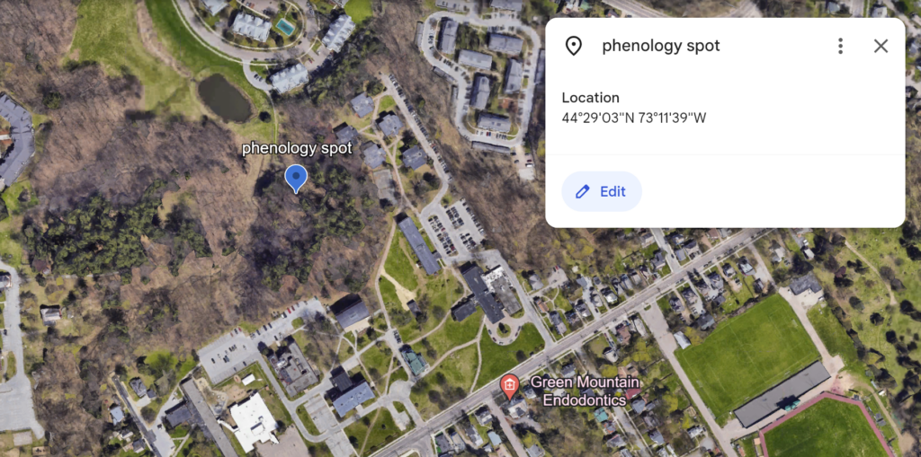 Trinity Woods is a hardwood, old growth forest found behind the Trinity Campus at UVM. I discovered it about a month ago during a scavenger hunt activity with some peers, and we instantly clicked with it and its landscape. To get to my specific spot in Trinity Woods, you walk to the front of the Trinity Campus, then walk between Mercy Hall and Farrell Hall until you reach the unmarked entrance into the woods. Upon entry, most trees are hardwood- with the most common tree species being Sugar Maples, Striped Maples, Paper Birches, Black Cherries, and American Beeches. Most of these trees are mature and in the overstory, but there is also a good number of American Beeches in the understory. Besides this, the understory is populated with a large number of ferns but is not particularly dense. As I got further into the woods and closer to the stream, where my actual phenology spot is, there were some large Eastern White Pines, Yellow Birches, and Green Ashes.