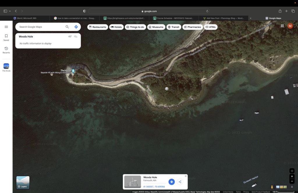 Over Break I went back to my home town on Cape Cod called Falmouth. The Area I choose is one that I have been going to since I was little. Its at a place called the Knob and as you can see in the Google Maps photo is surrounded by the water of Buzzards Bay.